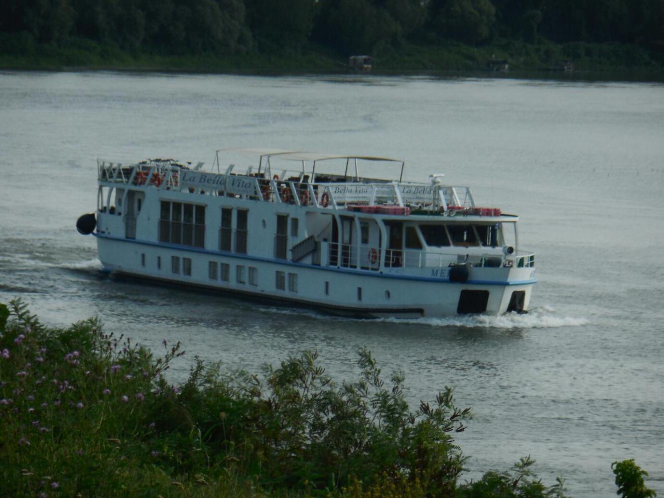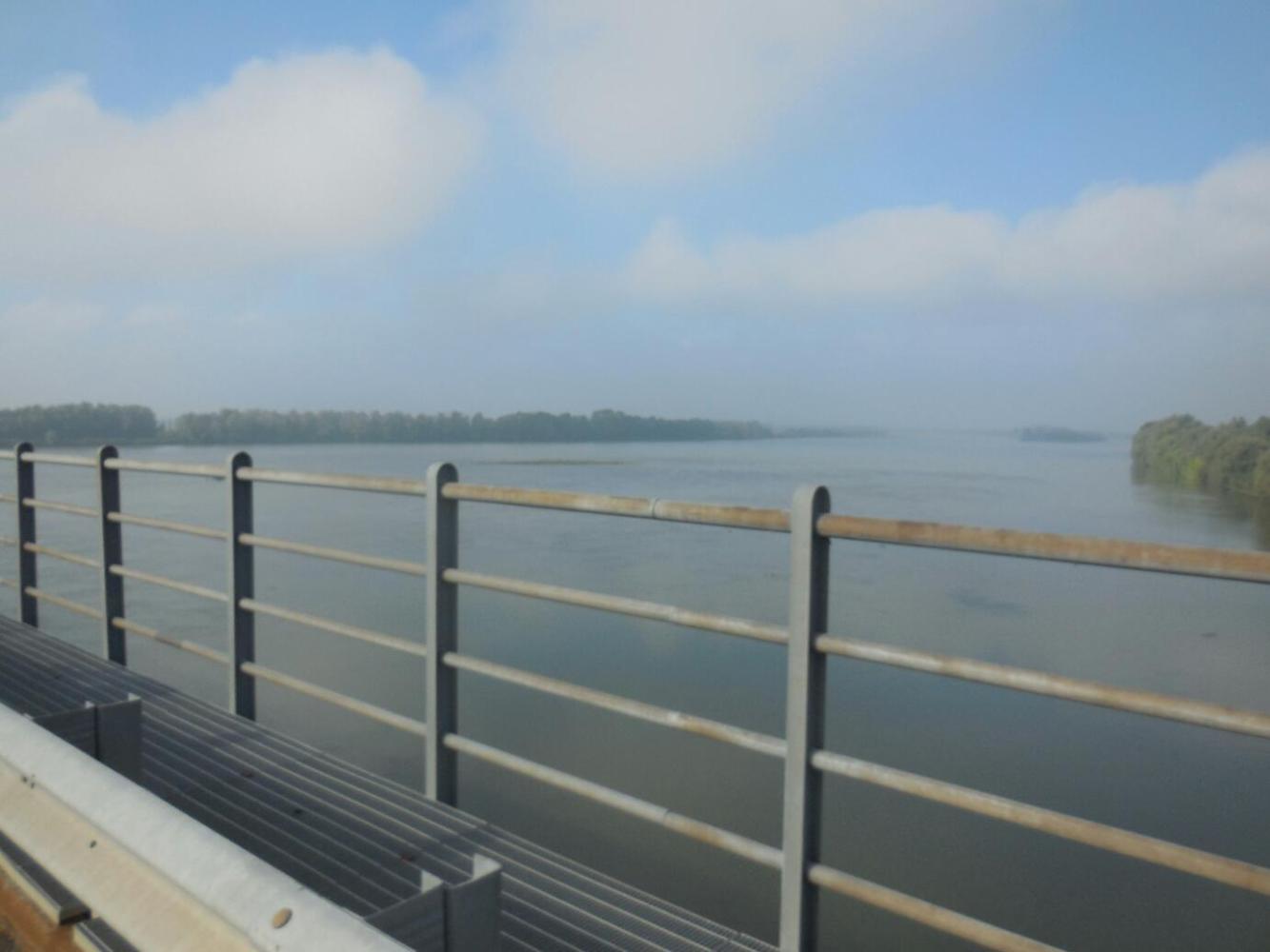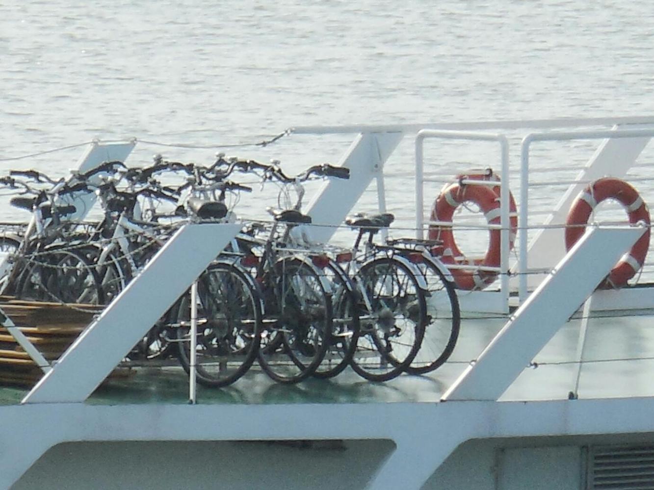 To our right from the dike top was the river. It was wide and brown and seemed to move rather slowly. We were surprised to note that though the river was placid, there was no boat traffic at all. That is, no pleasure boats, no barges, no river tours, no ferries. Ok, one boat did come along. It seemed to be some sort of boat and bike thing, since there were a lot of bikes stowed on deck. We could look it up sometime, but that was it.