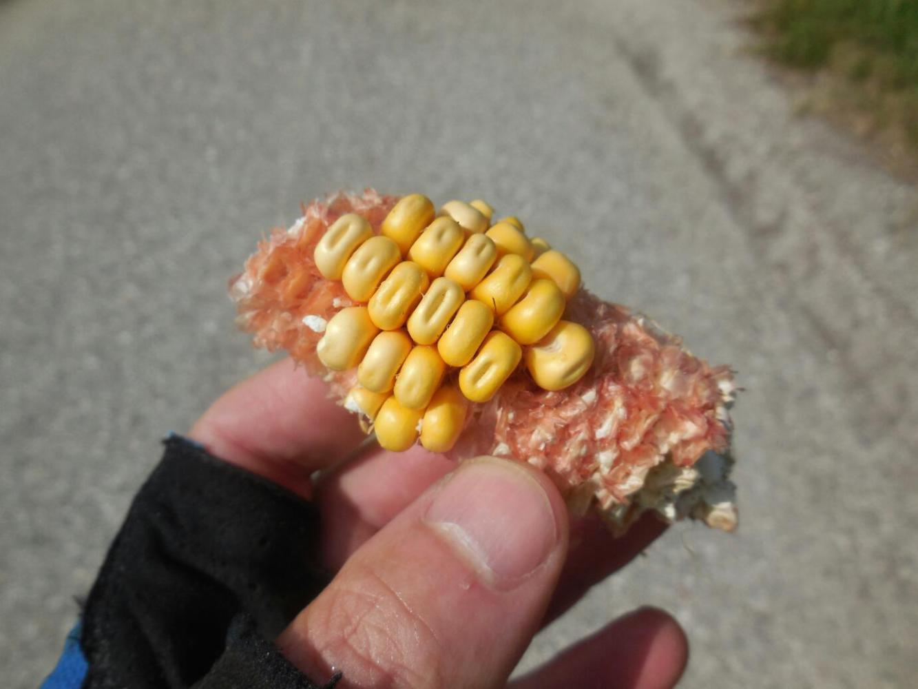Back up on the dike, we continued riding along. It was much like dike riding in Netherlands - minus the sheep - but rather boring. Below us to the left were scattered farms, growing mostly corn. At first we thought that the corn had somehow been left since last year, since it was so totally dead and dried out as it stood. But now combines were harvesting it, revealing the yellow kernels on cobs that were red.