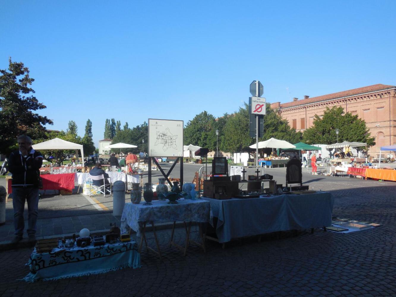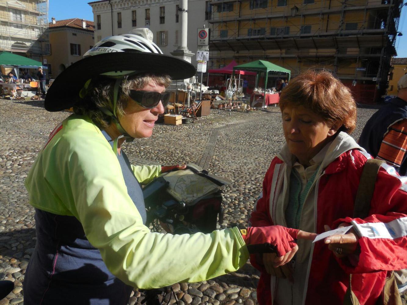 As we walked our bikes into the square, one of the vendors approached us. It turned out to be Hilde, a lady that lives about 10 km away. The flea market is a once monthly affair, which she probably attends each time. We didn't get to see what it was that she sells. However, she was interested in Canada because she not only travels a lot but also has a best friend from Montreal. Hilde's English was excellent, and we had a wide ranging discussion about economic and immigration crises in Europe and Italy, and difficulties being experienced in the Chinese economy.