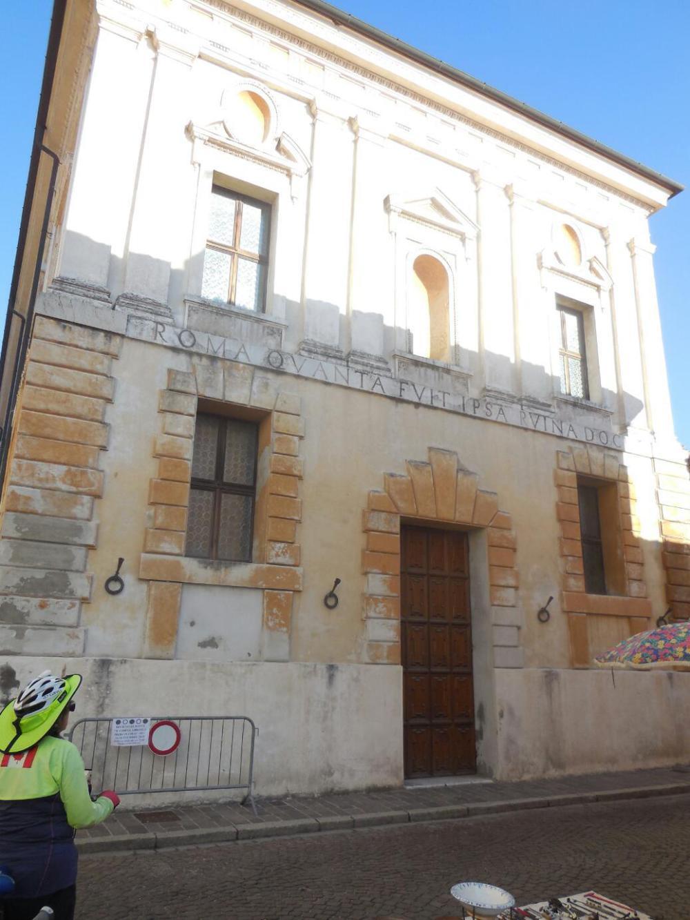 Hilde also gave us a good rundown about Sabbioneta, how it was founded in 1556 by Vespasiano Gonzaga, a member of the family that ran Mantova, and how it was planned from the start as an ideal city. The plan began with a complete wall, 90 percent of which is still there, and with streets that were basically on a 90 degree grid. Inside, there are 15 important buildings, ranging from the Ducal Palace to two churches and an Oratorio, to one of the first dedicated Theatres. There is also a synagogue, reflecting the liberal policies of the Duke.