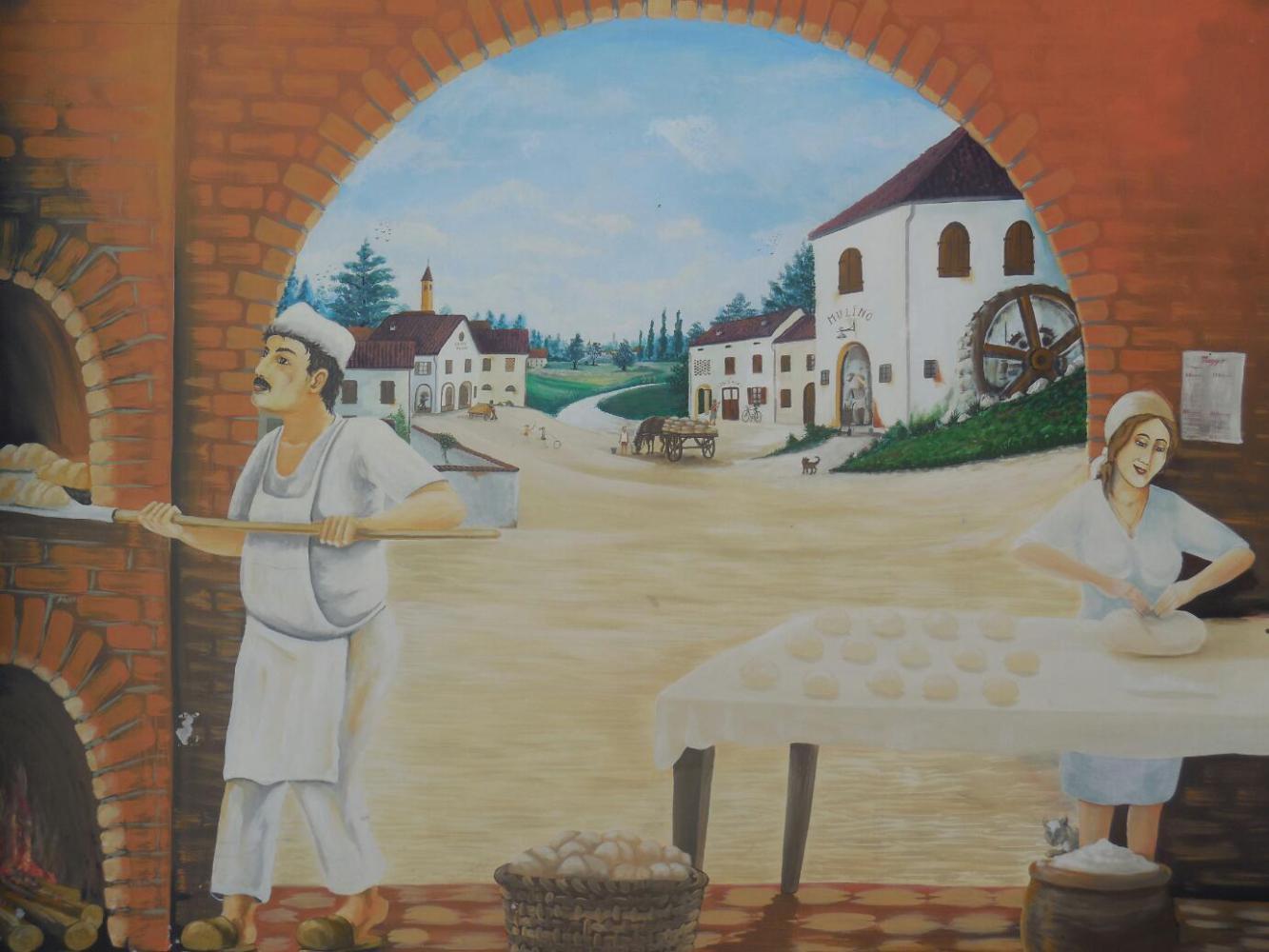 Roncadello was a village that we dropped into just to see what was there. The first thing we found was a lady sweeping the street in front of her house - both sides. No doubt some errant leaves had strayed into her territory. Can't have that. Some of the other things were a nicely painted pink house, and a funky Bar. A Bar here is not totally like one back home. While drinks are commonly served, so is food, such as breakfast. A Bar is more like a Snack Bar to us. Finally, there was indeed a church tower and quaint streets. One thing I particularly liked was a painting on the side of a bakery, depicting a baking scene.