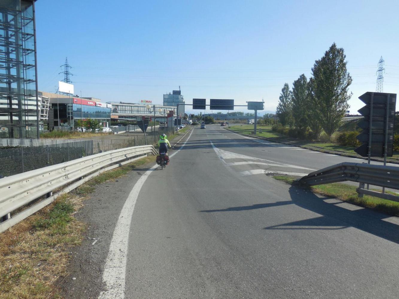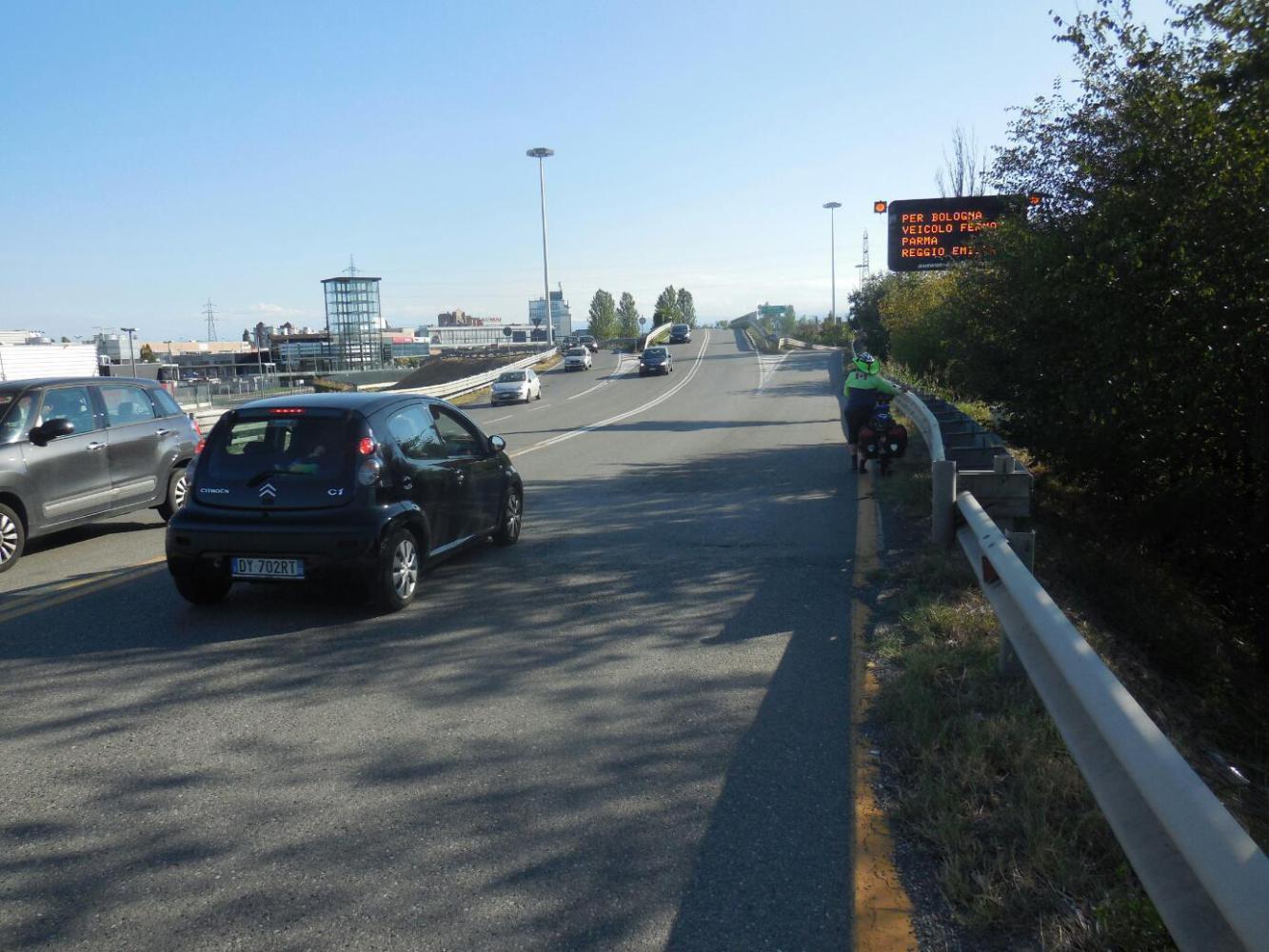 This changed as we drew a little closer to Parma. Now the Bikeline track was leading us onto busy shoulderless roads. Where they did show some kind of bikeway, it would be on the other side of uncrossable roadway. We ended by doing stunts like crossing high speed off ramps and cycling down on ramps, in and around major highways. In two cases, we only succeeded in crossing whatever all we were attempting because drivers came to a stop and blocked the traffic behind them for us.