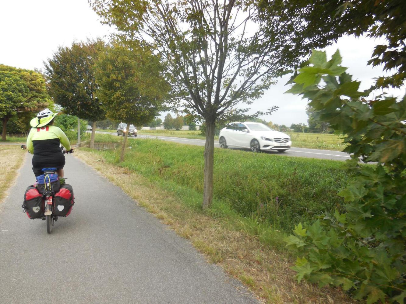 The track was one of the ones recommended by Elena at the Tourist Information, and for which we had the gpx. This started off as a paved path separated from the road, and we were really happy. Thoughts of cycling all over Italy on paths like this in future years began to emerge. After not long, a check of the GPS revealed we were off course. But we were on a road that headed straight for Treviglio, and it had a great bikeway beside it. Cool!, we thought. You can guess what's coming, right?