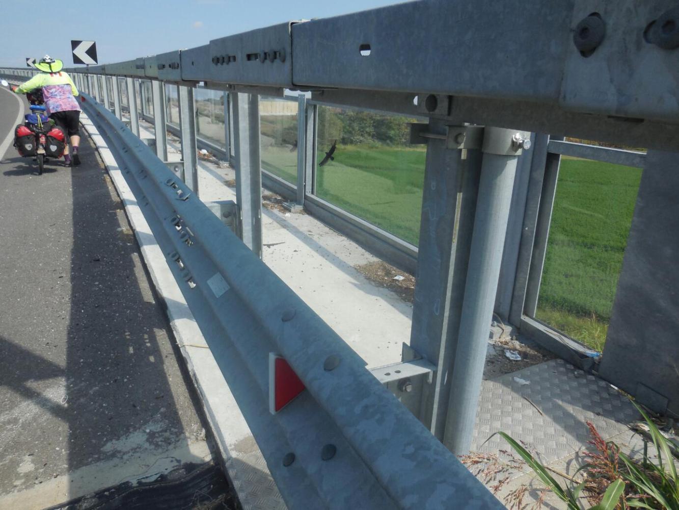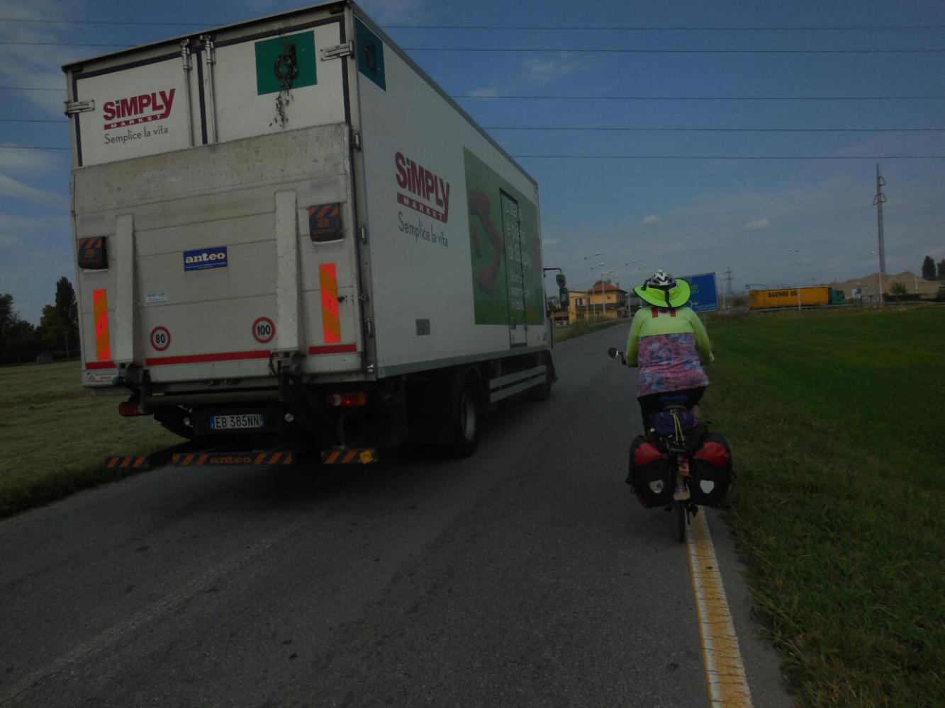 When we got to within 1 km of Treviglio a large overpass loomed. It was crossing a giant highway that was not even on our maps - must have been new. Dodie took one look and exclaimed 'I am notgoing on that thing!". So we retired to a shady corner with the GPS to consider our options. Sure enough, 5 minutes later we were up on the thing. The devil of it is there was a perfectly wide and safe sidewalk on the overpass. But this was really and truly barricaded, and an extra high railing kept us from hopping over to safety. Fortunately, there was just enough shoulder beside the driving lane that we made it ok.
