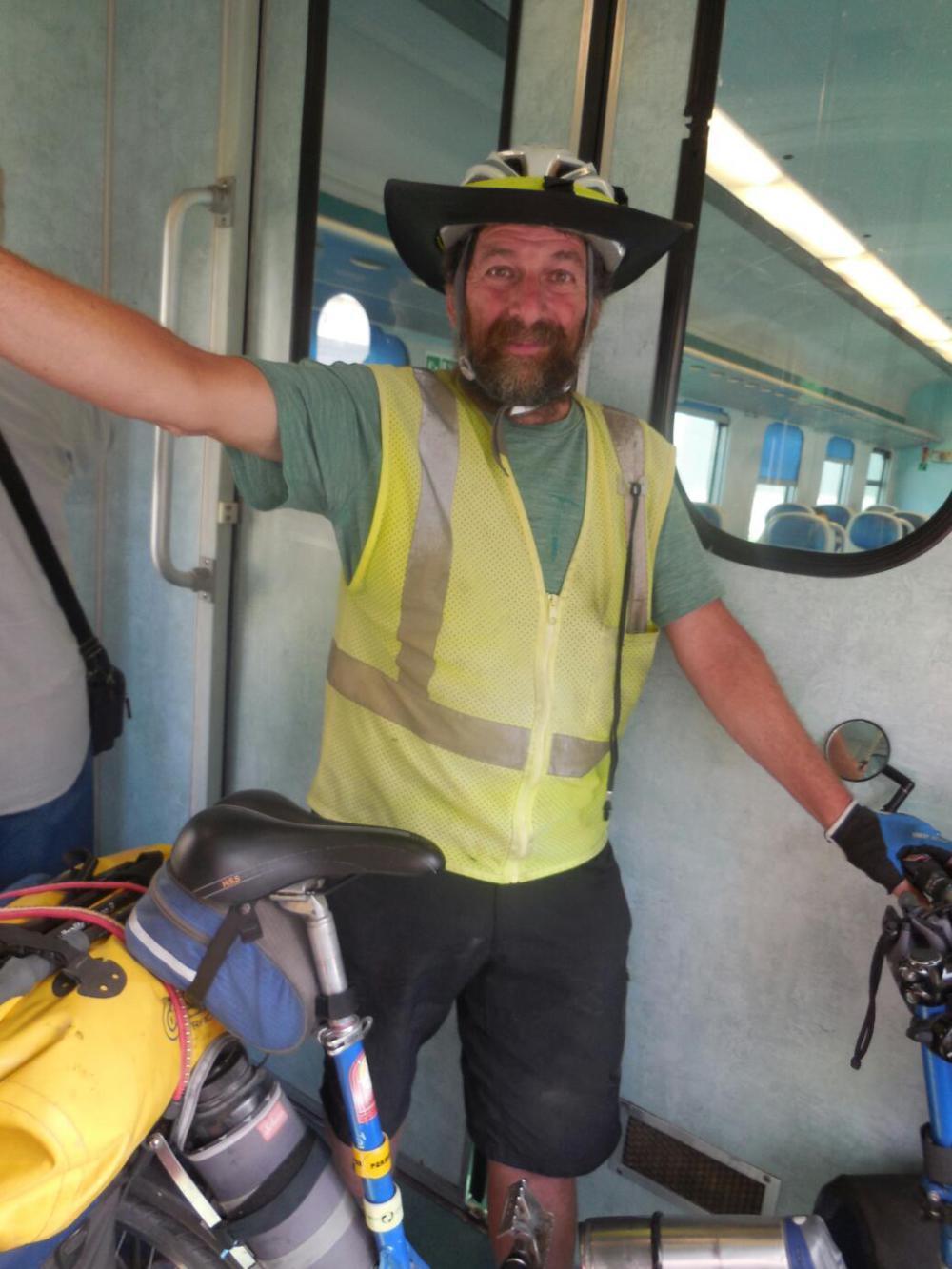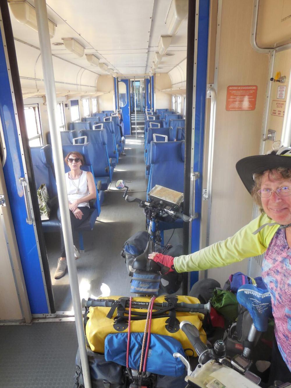 Now our travel tale for the day (isn't every day a travel tale?) shifted from track, trail, and highway to rail. This had all the classical ingredients: figure out where we are going, buy the correct tickets, understand the stations and transfer points and times and track numbers, and carry the fully loaded touring bikes up and down all kinds of stairs. Fortunately (as usual) all the brain work parts were done by Dodie, so I only had to lift the impossible weights.