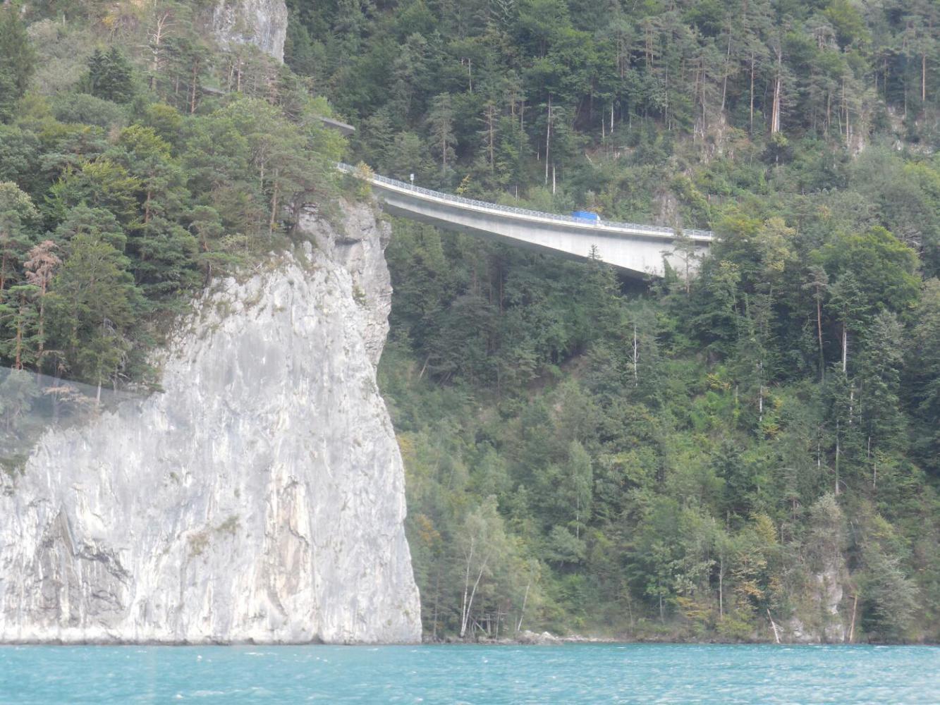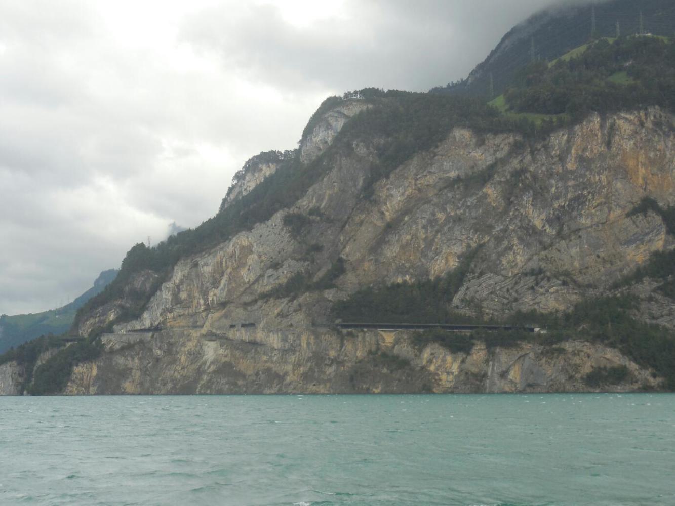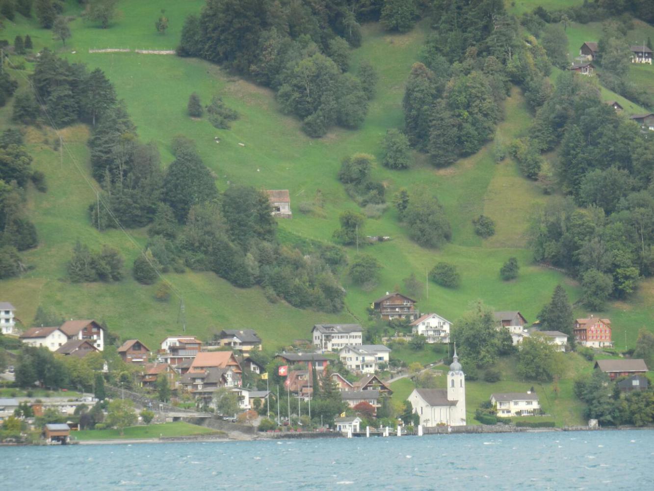 Lake Lucerne is a beautiful body of water, set among steep mountain slopes. The water is greenish, reflecting no doubt a bit of glacial runoff. The shores and slopes are adorned by various lovely buildings and by alpine meadows, some very high up. Our position for the night at Fluellen is at one end, and Lucerne is at the other. The "official" cycle route calls for using the passenger ferry to bypass an impossible stretch of road, the Axenstrasse, that goes north from Fluellen. Then in principle we could cycle a bit, before ferrying to the other side of the lake, at Beckenried. From there, theoretically one can cycle on to Lucerne.