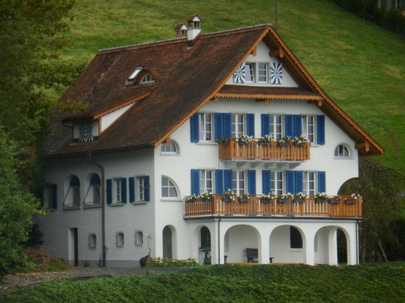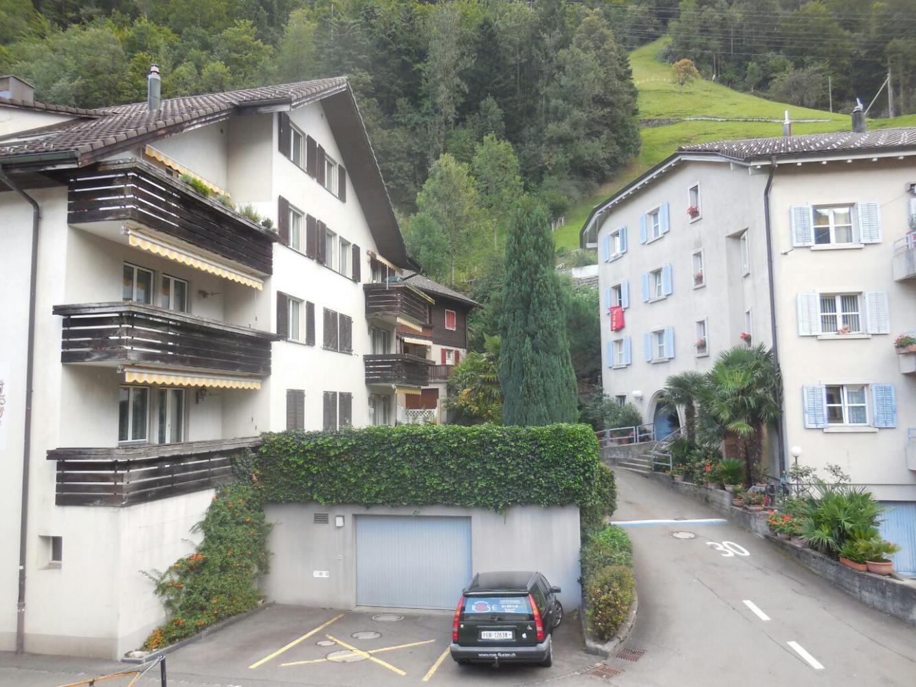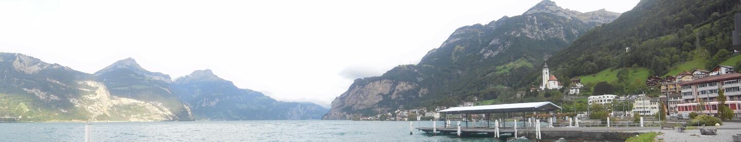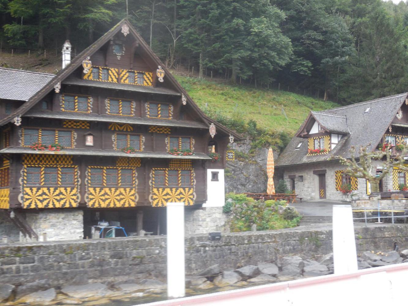 Lake Lucerne is a beautiful body of water, set among steep mountain slopes. The water is greenish, reflecting no doubt a bit of glacial runoff. The shores and slopes are adorned by various lovely buildings and by alpine meadows, some very high up. Our position for the night at Fluellen is at one end, and Lucerne is at the other. The "official" cycle route calls for using the passenger ferry to bypass an impossible stretch of road, the Axenstrasse, that goes north from Fluellen. Then in principle we could cycle a bit, before ferrying to the other side of the lake, at Beckenried. From there, theoretically one can cycle on to Lucerne.