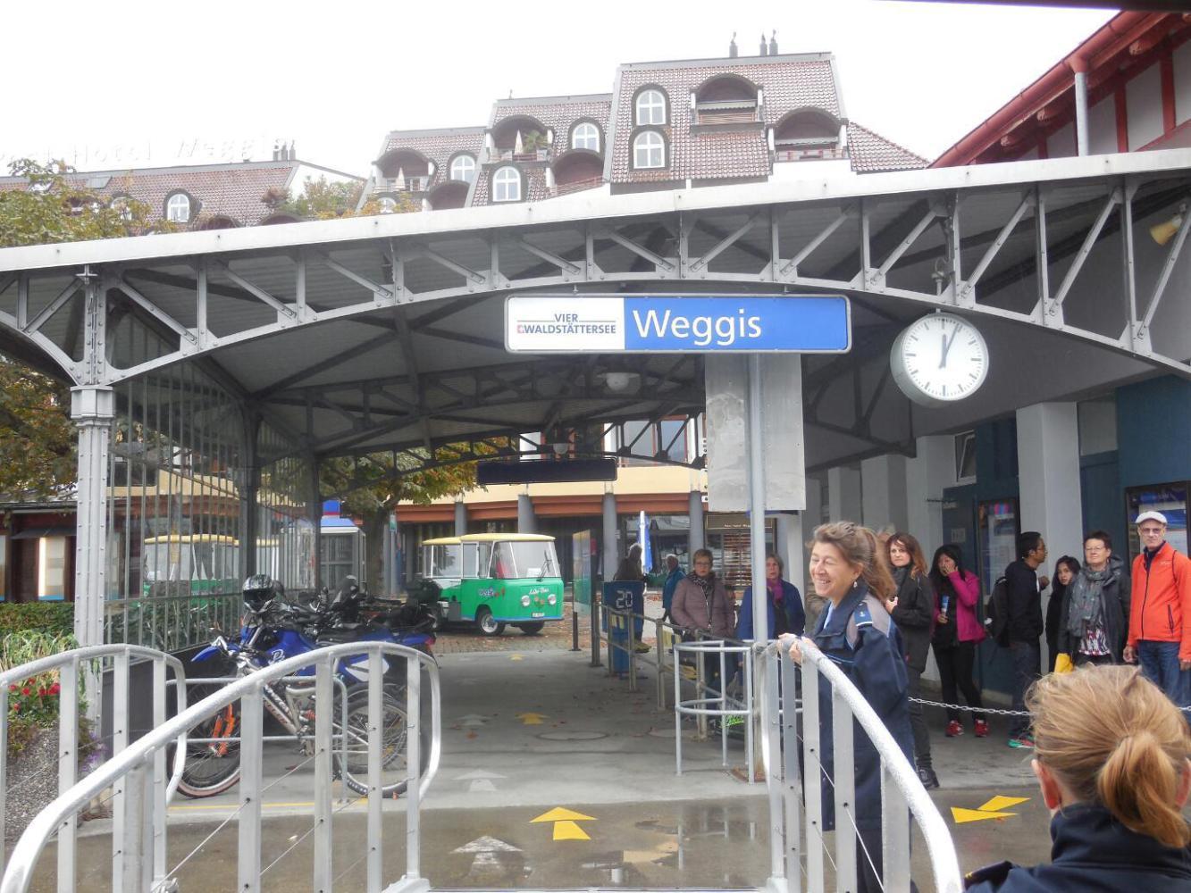 Our ferry was the MS Rigi, a quite elegant and very capable small ship that is part if a small fleet of similar type. The Rigi was built in 1955, but comes from a tradition of lake boats that extends to the 1850's. The Rigi had lots of room for our bikes, and otherwise is fitted out with tables and chairs. From a pamphlet of the shipping company, we could see that they do a lot of dinner cruises on the lake. A really nice looking one was 1 1/2 hours, with a gourmet Indian meal. As it was, they were offering croissants and coffee, packaged ice cream, and also sandwiches. A sandwich would run you CHF 9.50 (9.50 Swiss Francs - about the same as 9.50 US) and a packaged ice cream was 3.50. Dodie called this "BC Ferries pricing - Swiss style!".