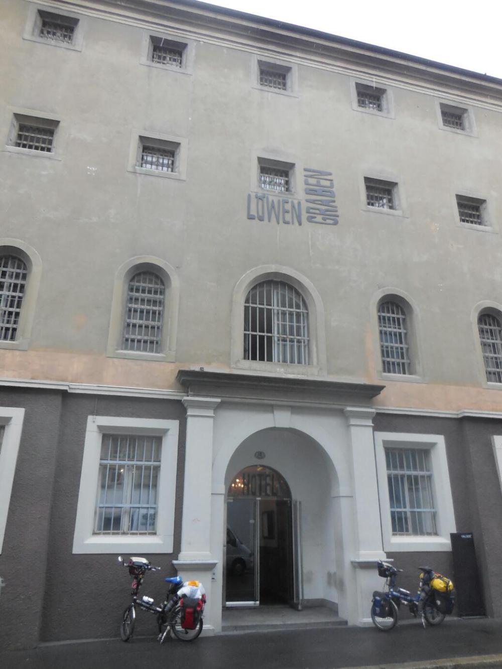 Our final activity was to fire up Booking.com and tut tut about the high cost of nice looking hotels we saw near the docks in the various towns. Finally, we had a look at Lucerne, where it seemed advisable to stop for the day. Using the price filter on Booking, the top price was given as CHF 699+ and the minimum was CHF 90. I generously set the range at 90-120, and Booking came up with exactly one place - the one at 90. This place was called the Jail Hotel. Up until 1998 it had actually been the city jail. That seemed neither here nor there. We liked the minimal price (though exorbitant outside of Switzerland) and the fact that the place was located right in the old town, and on our cycle route. So we booked it.