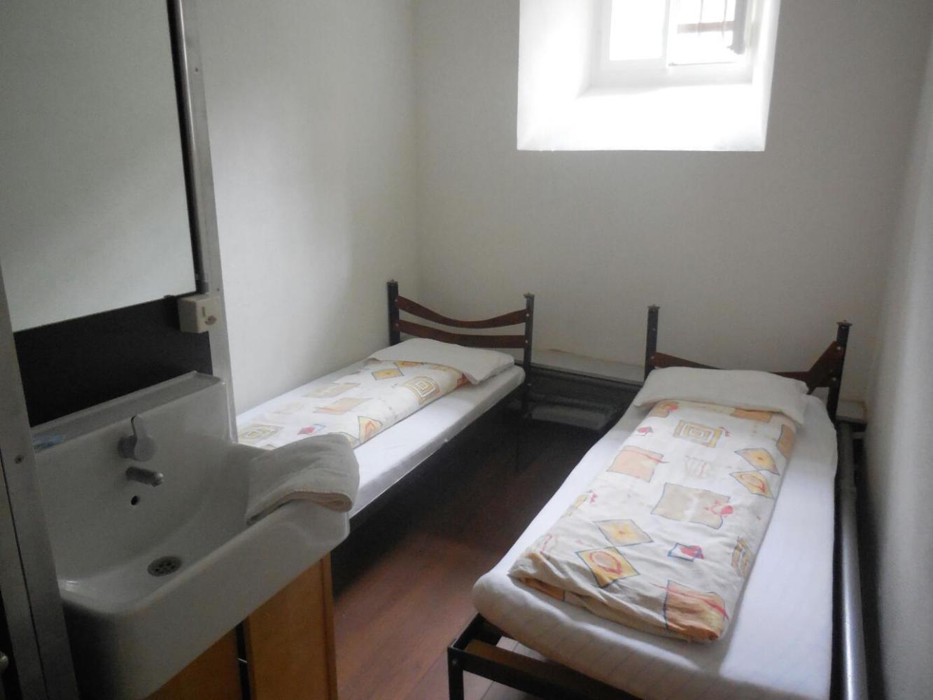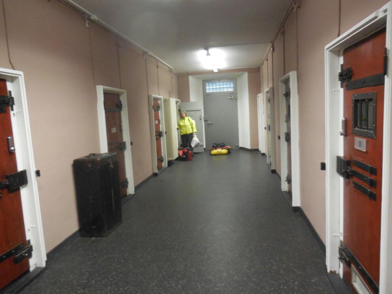 We then proceeded directly to Jail. The place still has bars on the windows, and in fact being the jail remains its claim to fame. Rooms are named for what type of cell they were, and there are displays of jail artifacts in the corridors. The corridors are of course jail corridors, and guess what - the rooms are cells. That means they are extremely small, have little, high windows, and cots. So yes, we really have gone to Jail. Maybe it's more like debtor's prison, our crime being that we only had CHF 90 to spend. Actually, that's not quite accurate. Dodie went crazy and dropped a further CHF 20 which buys us two passes to dine in the prisoners' mess at breakfast tomorrow.