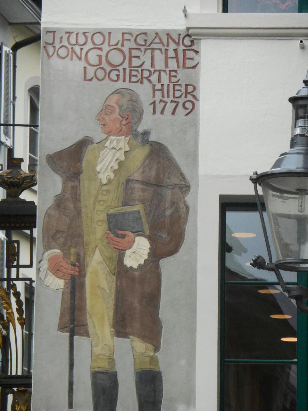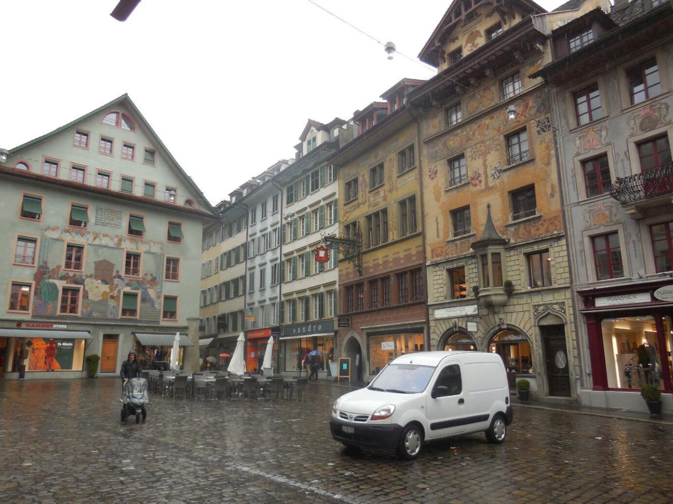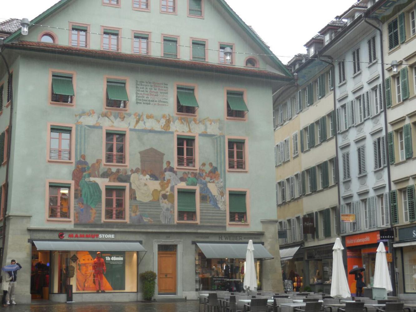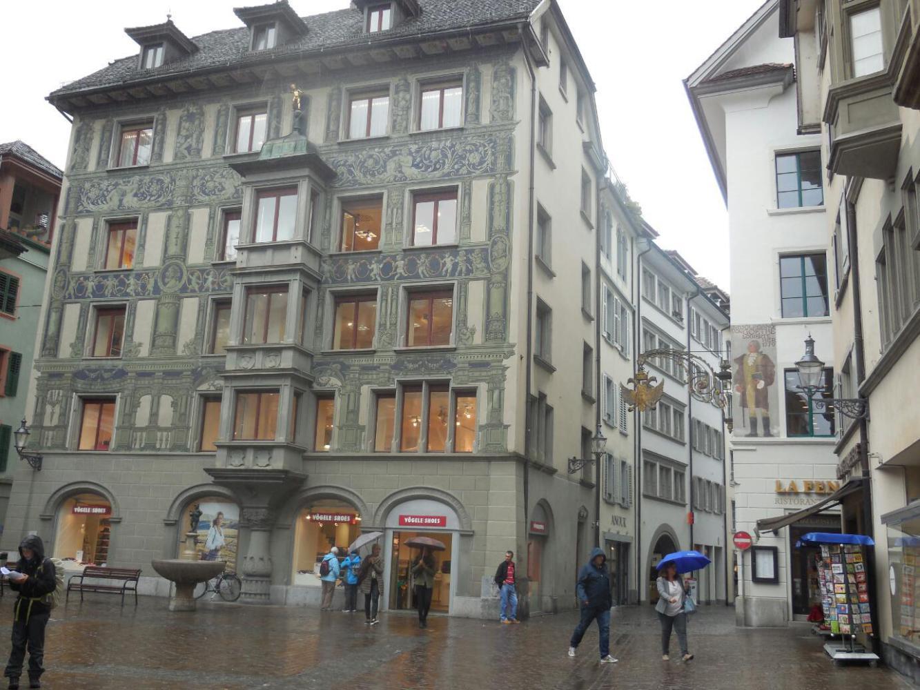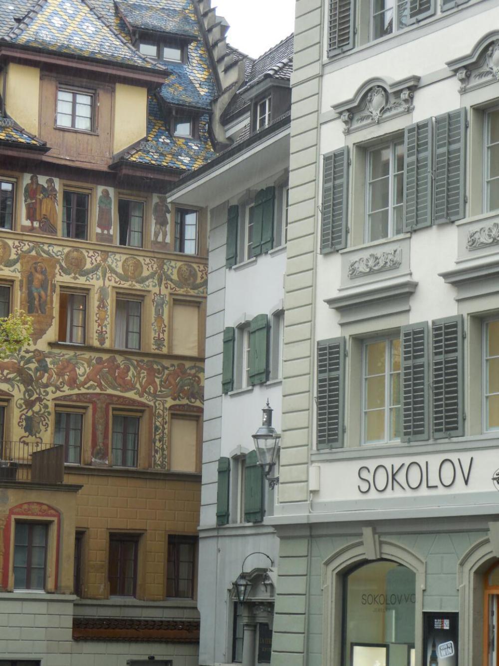 It was hard to do much photography because of the rain (could have bought a decent low quality umbrella for CHD 39.50, however) but maybe we did capture much of the charm of this really nice place. We tried to figure out what makes its buildings special. Firstly, they are neither too low nor too high - about six stories usually. Nor are they too narrow nor too wide. The windows are usually adorned, and the rooflines are complex. Finally, many buildings have fresco on the outside.