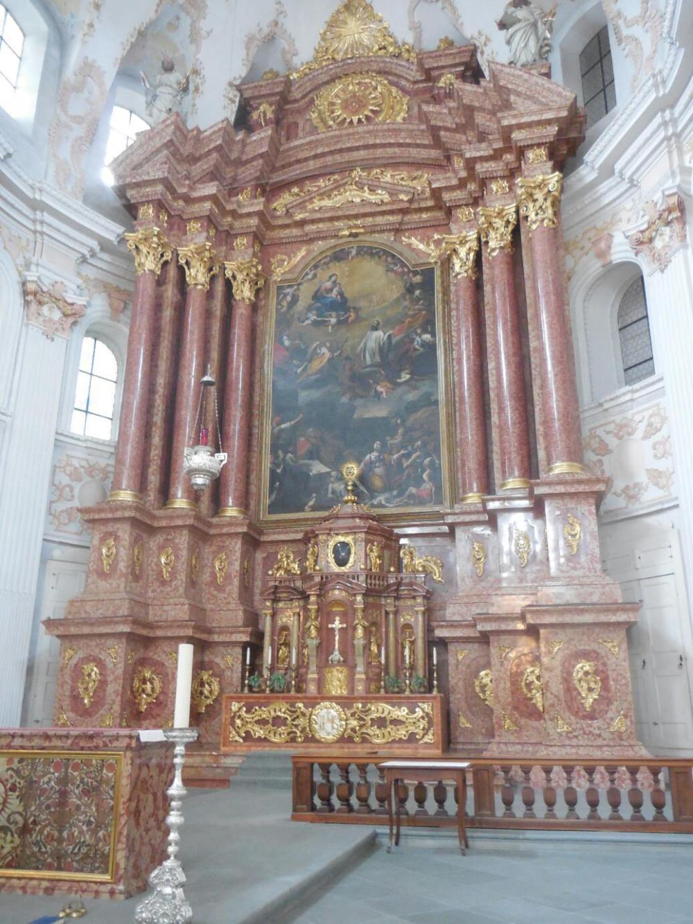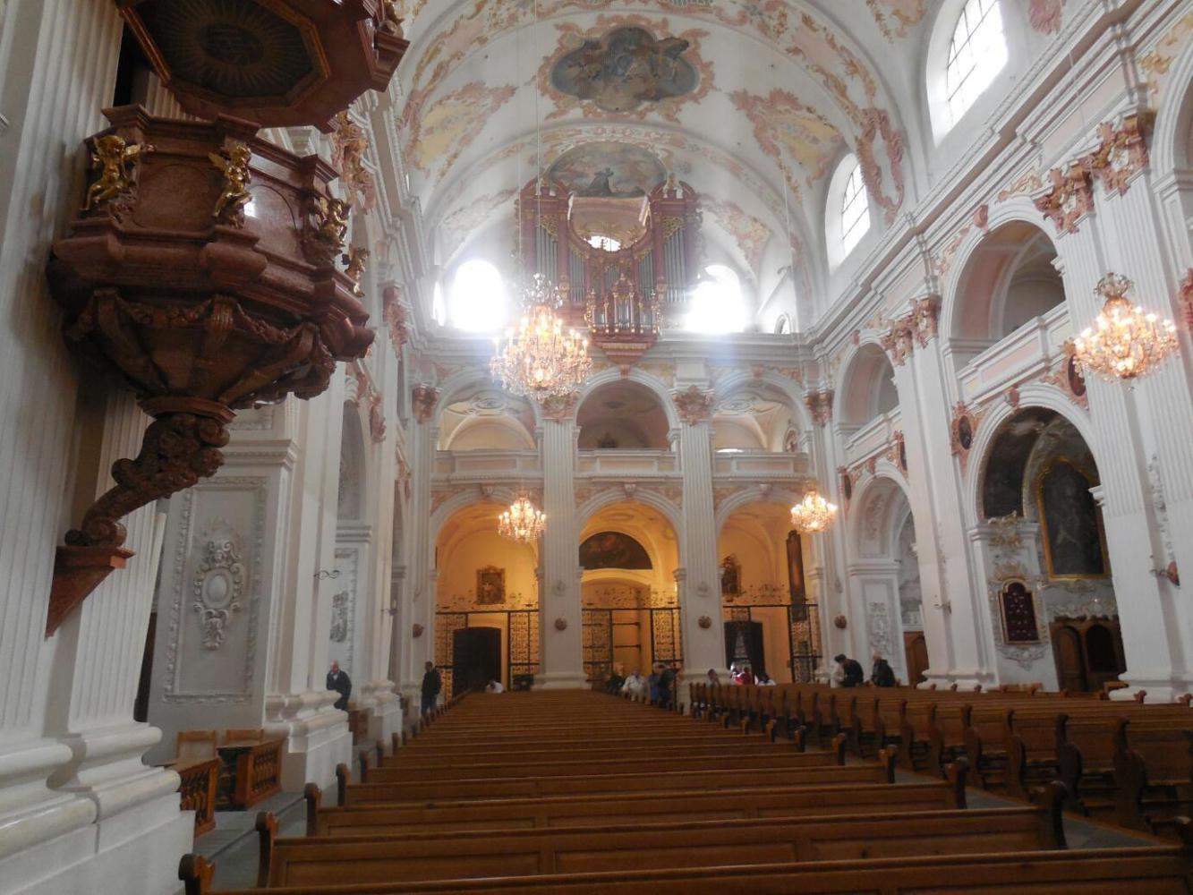 We also naturally visited at least one church - the Jesuit one, built around 1666. It was the first large baroque church built in Switzerland. Side chapels in this church seemed to feature a lot of bones from saints, but most were not named. We mostly liked the gold trim and pink marble everywhere.