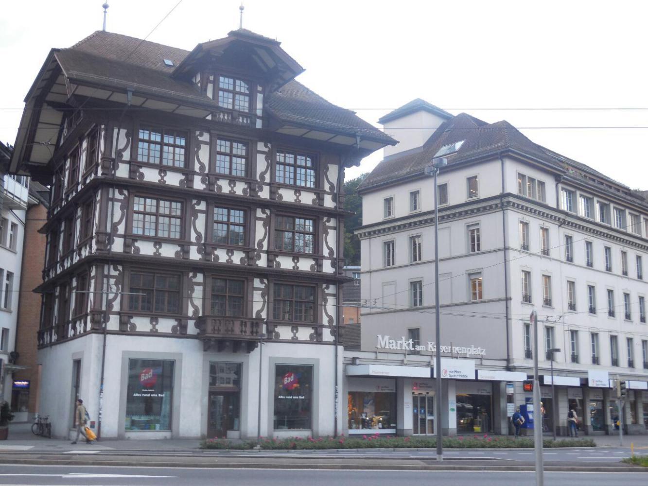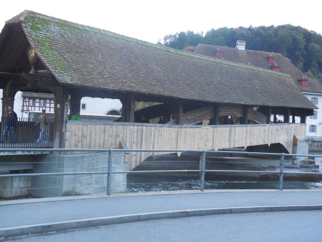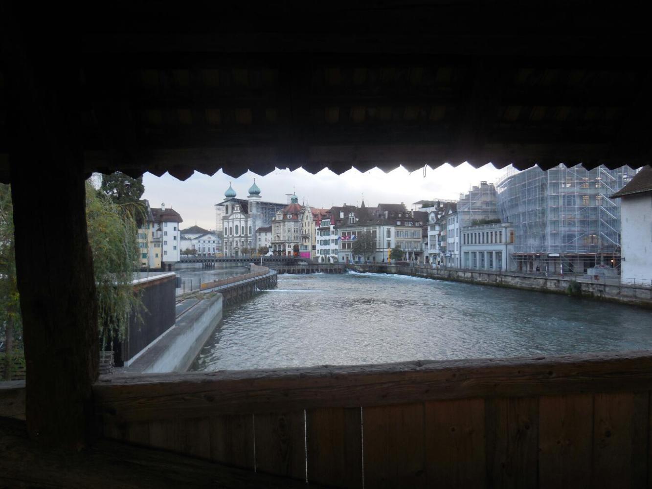 It started as we sprung ourselves from Jail and headed on a bridge over the Reuss, which is the river that starts around the Gotthard Pass and runs into Lake Lucerne, and finally out, through the middle of Lucerne town. The Reuss is not very wide at Lucerne, and it is spanned by a couple of historic wooden bridges. On the one we crossed there are old paintings depicting town history. Looking out from the bridge we got our last look at the beautiful Old Town.