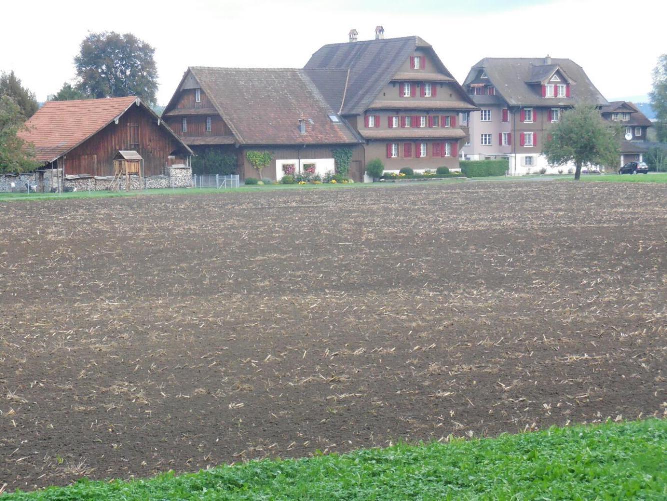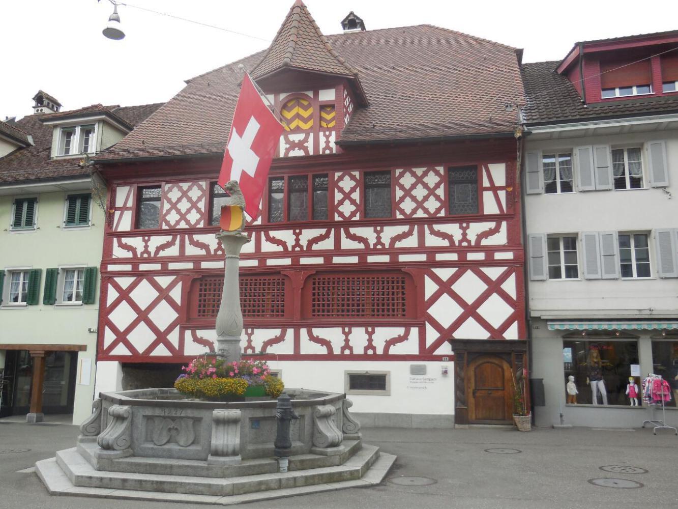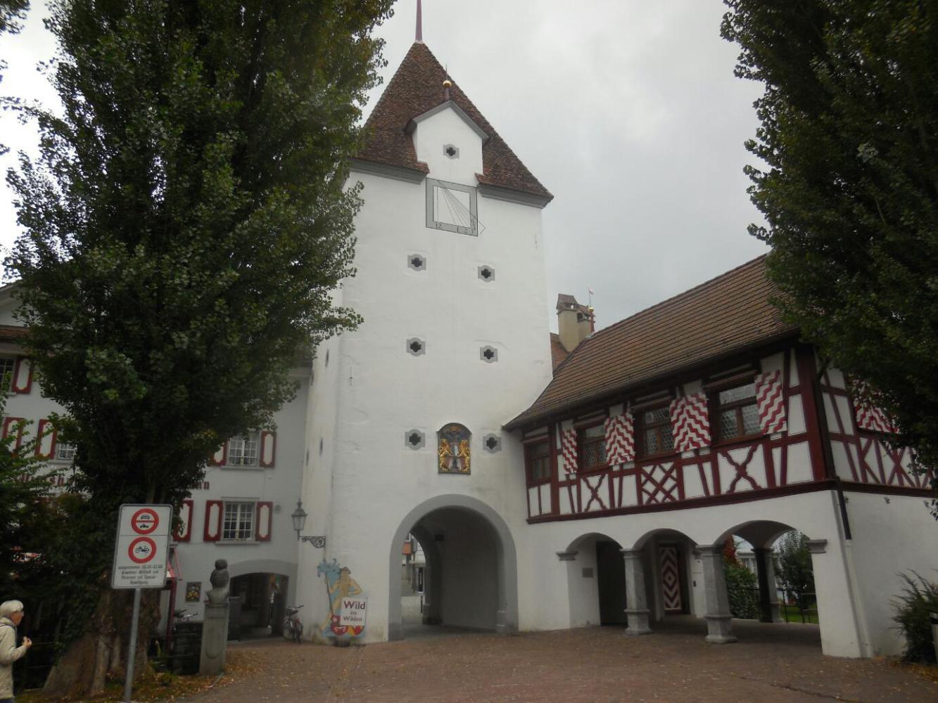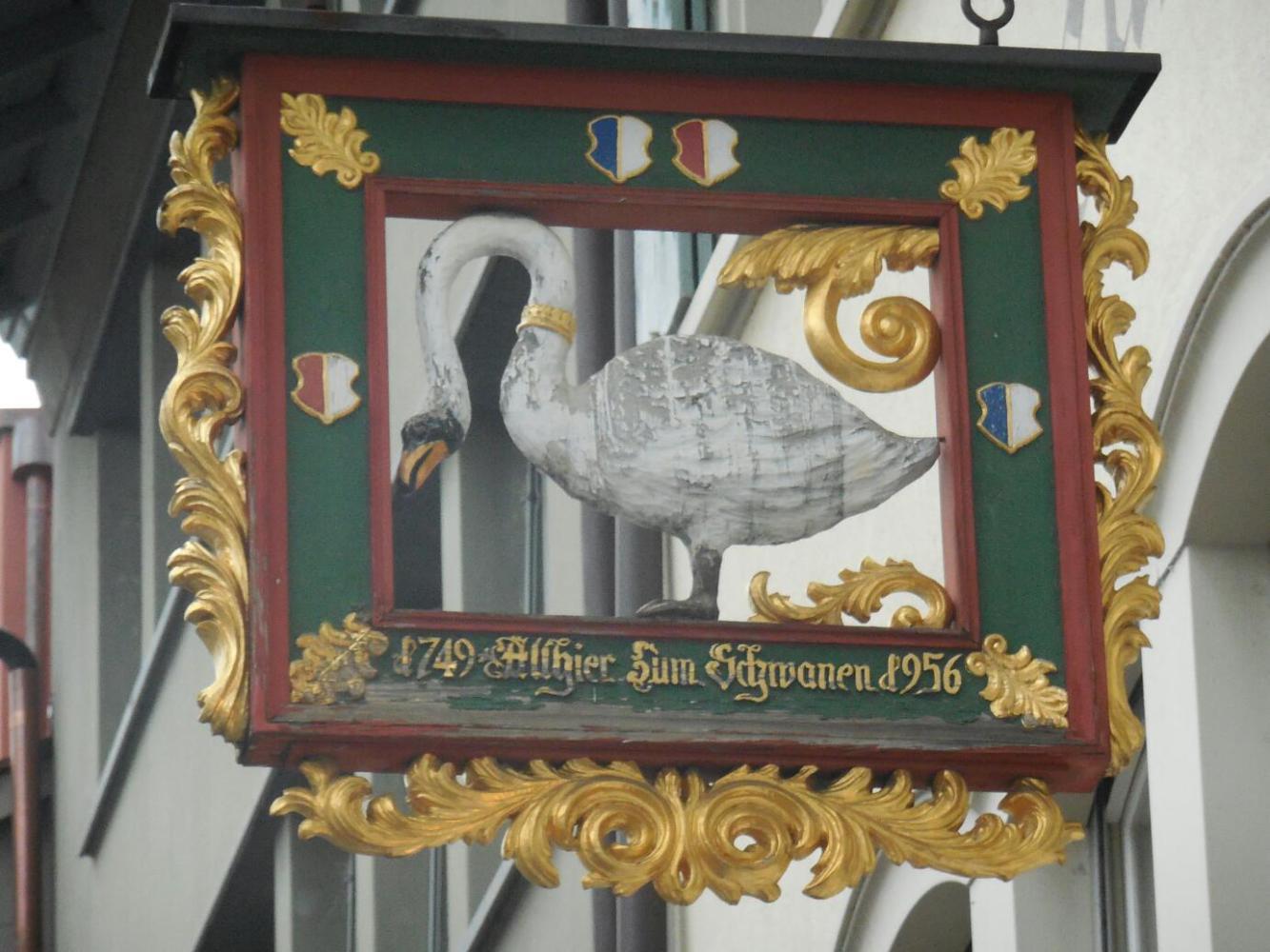 Sempach is at one end of the Sempachersee, a beautiful lake, though not nearly as big as Lake Lucerne. With the mountains gone, this lake has gentle hills around it, all covered in a patchwork of pasture, crops, and nice buildings. At the other end of the lake lies Sursee, another great village. It too has gates, banks, and bakeries. A small debate erupted (but just inside my own head) as to whether one full fledged bakery and two cafes selling baked goods should properly be counted as perhaps two "bakeries". Anyway, Sursee had them! There was also a guesthouse called Zum Schwanen. Guest houses named for swans, lambs, stags, wild men, the sun, and crowns, are our favourites. Here is the sign from Zum Schwanen: