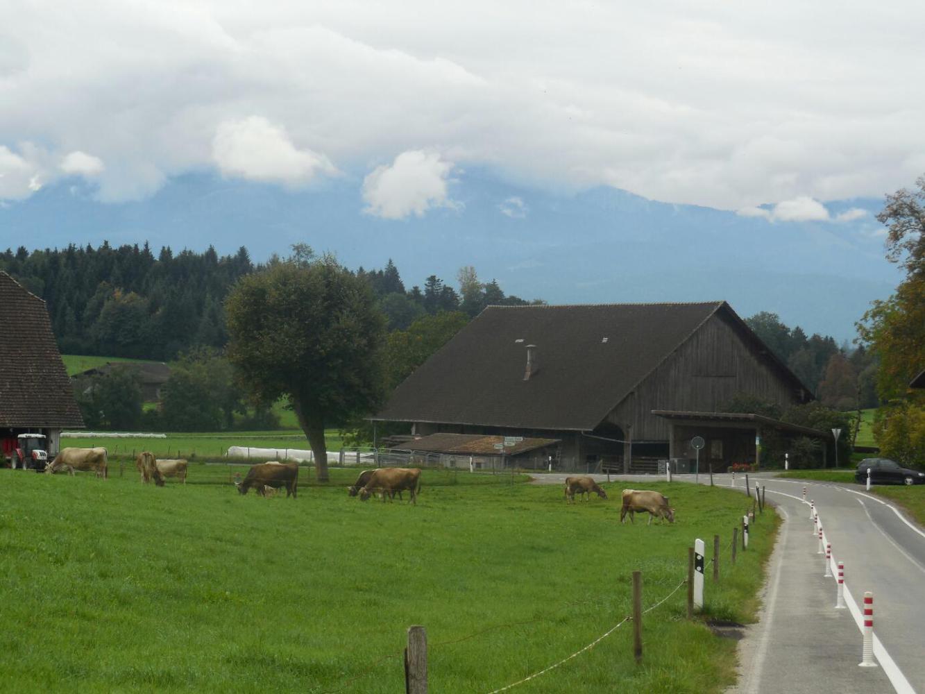 We now entered an area I had worried about, since the track for it was depicted by a dotted line on the Swiss web site. However it turned out to be fine - a hard packed car free wide gravel trail through farm land. Here we met lots more cows (each time triggering a get acquainted stop), plus crops like cabbage, lettuce, and carrots. We stopped to "get aquainted" with the carrots as well. It really was a pleasant ride, though we had to put raingear on and off periodically.