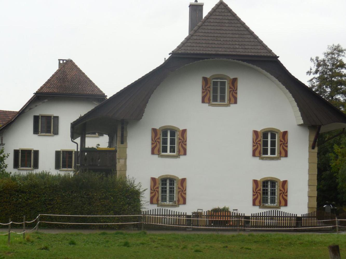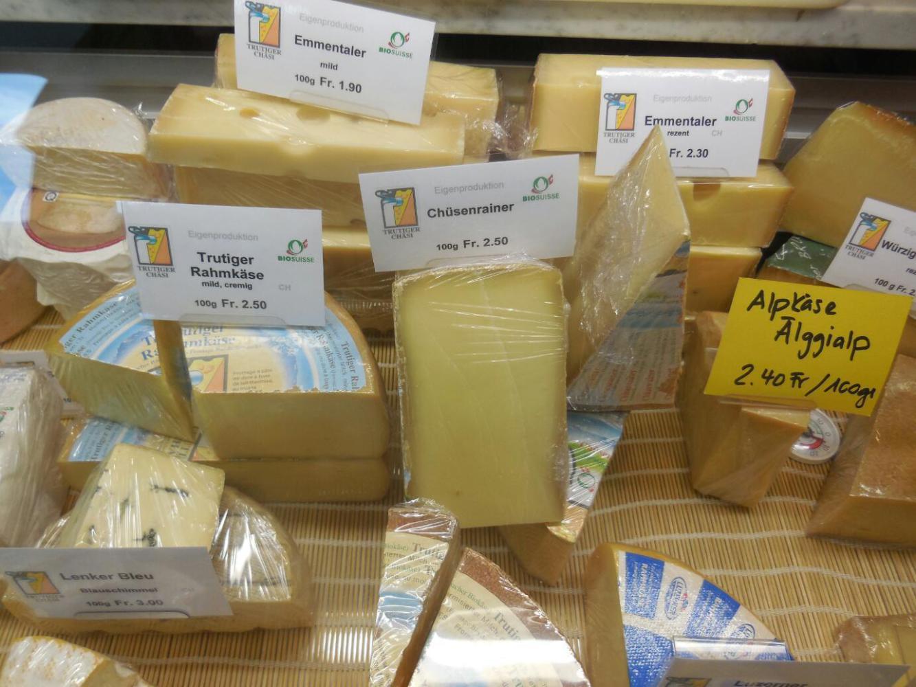 We carried on, following the Swiss 3 signs, until we came to a sign that said Trutiger Chasi. I puzzled over this, but Dodie quickly realized it was a dairy, and they were open for on site cheese sales. We pulled in to the farmhouse/dairy, so glad to have stumbled on it. In Parma they had advertised dairy tours, but we would have had to find one on our route and make an appointment. We were sorry that did not work out, so were all the more glad about this one. We did not ask for a tour, but only peeked through the doors. Then we entered the little shop, to be greeted by the cheesemaker's wife (we assume). We were able to ask her if all the cheeses had been made on site, and then to learn which had and which had not. We bought some Emmentaler that had been made there. They also made yogurt, and we chose one chocolate and one hazelnut, in great little plastic resealable bottles.