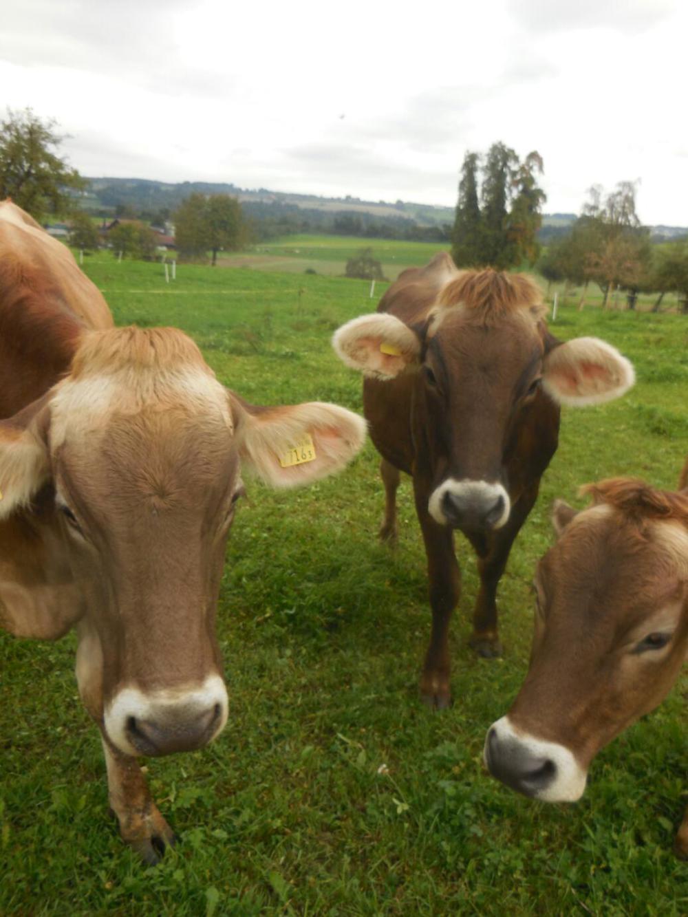 The Alps were now behind us, but that did not mean an end to postcard quality Swiss scenes. It was a ride with sights like those I had been anticipating, when writing "Where's the cheese?" type comments two days ago. The trail took us past some beautiful farmhouses, lands, and animals. Of course, my favourites among these are the Swiss cows, and I managed to make friends with these three:
