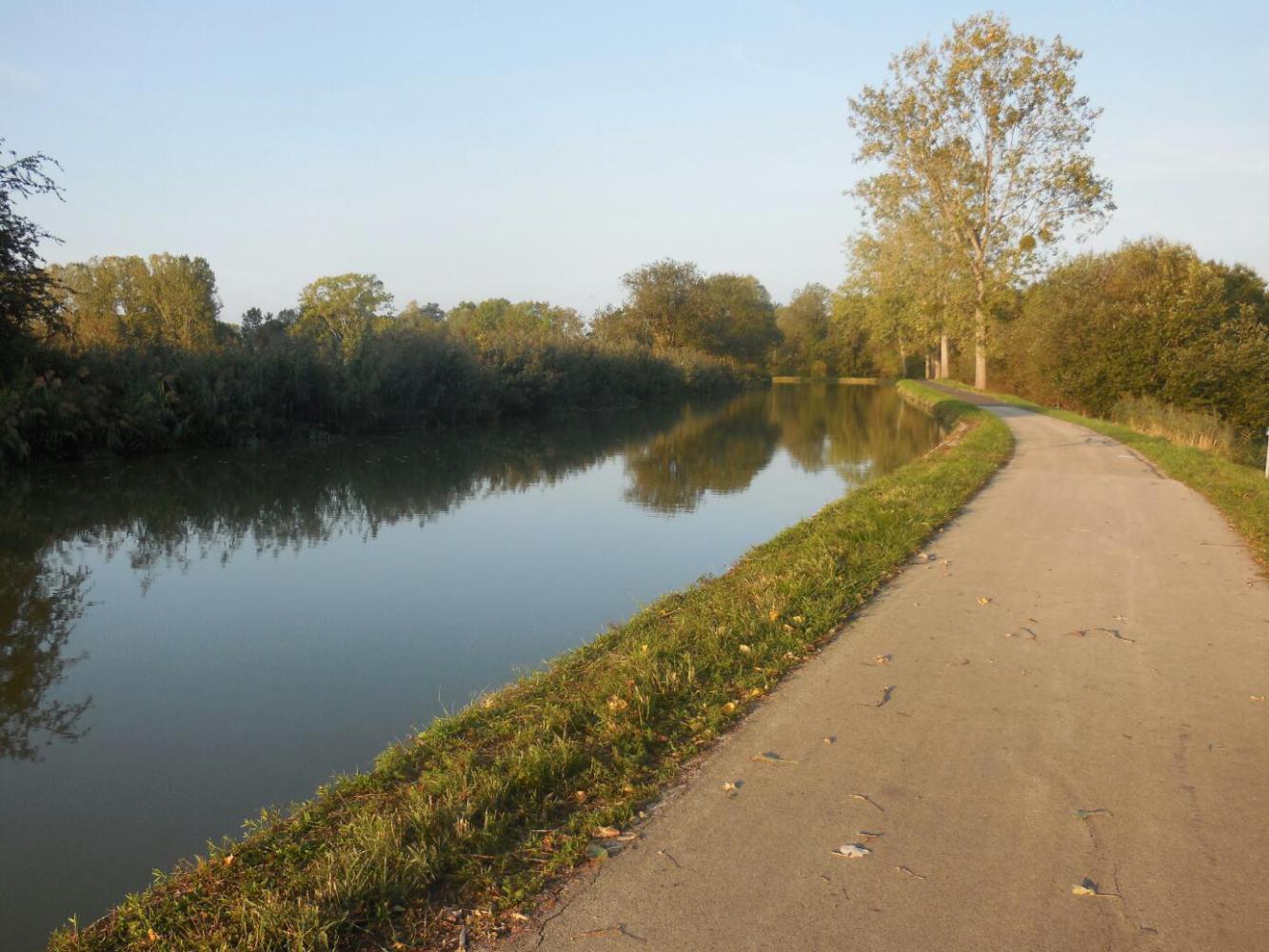 As soon as we got onto the EV6 we were on the Canal du Centre, which would be our central focus for the rest of the day. It was again totally lovely cycling, with a great path and the glassy water. We did soon pick up a fairly brisk head wind, which at the end of the day could be blamed for our being just a little extra tired.