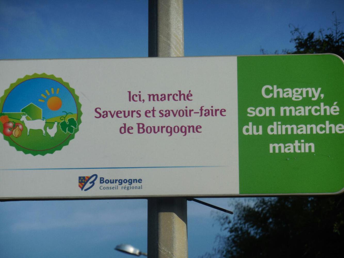 The guidebook that Keith gave us (EV6 from Bale to Nevers from publisher "Chamina") had alerted us that there is a market in Chagny on Sunday, and we were making a special effort to get there in time, just because we like any market. But at the entrance to the city there was a clue that something special could be coming. The first sign was one about the Sunday market.