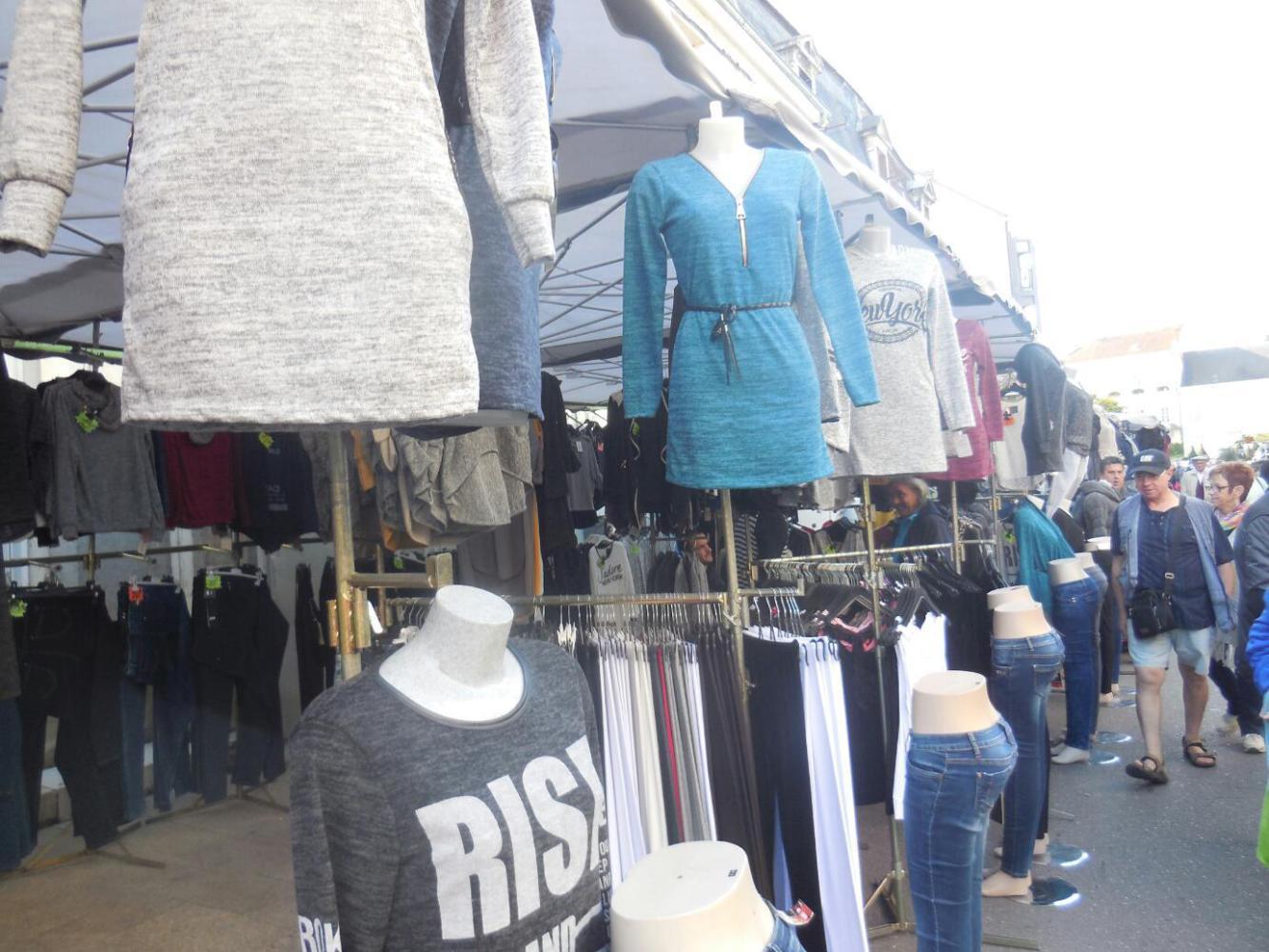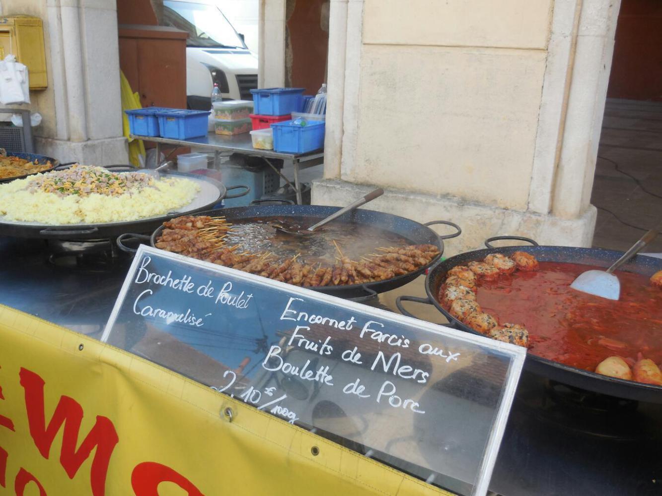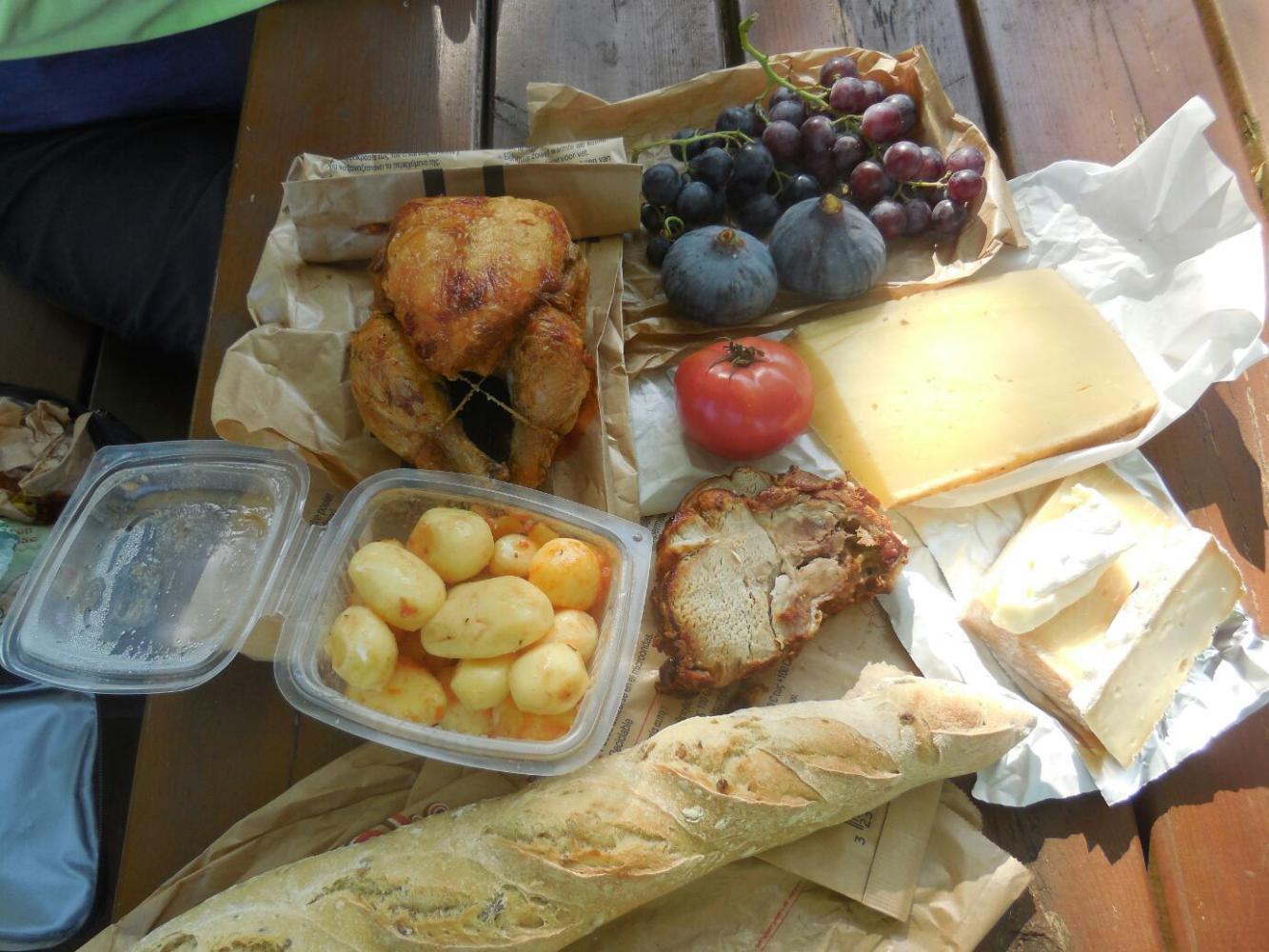 It only took a few blocks to arrive at the market, but we were initially a bit put off because it seemed to be all vendors of low quality new goods like handbags, sunglasses, and jeans. Pushing on deeper, though, we came to a pocket of the real thing. What we look for in a French market is first off, of course, the cheese. Next comes bread, and dry sausages, and fruits, but the big treat is the BBQ chicken truck. Normally these also offer pork tenderloin, and my favourite, roasted potatoes.