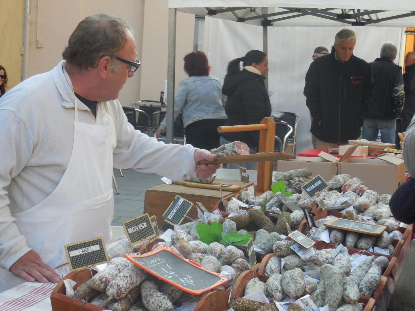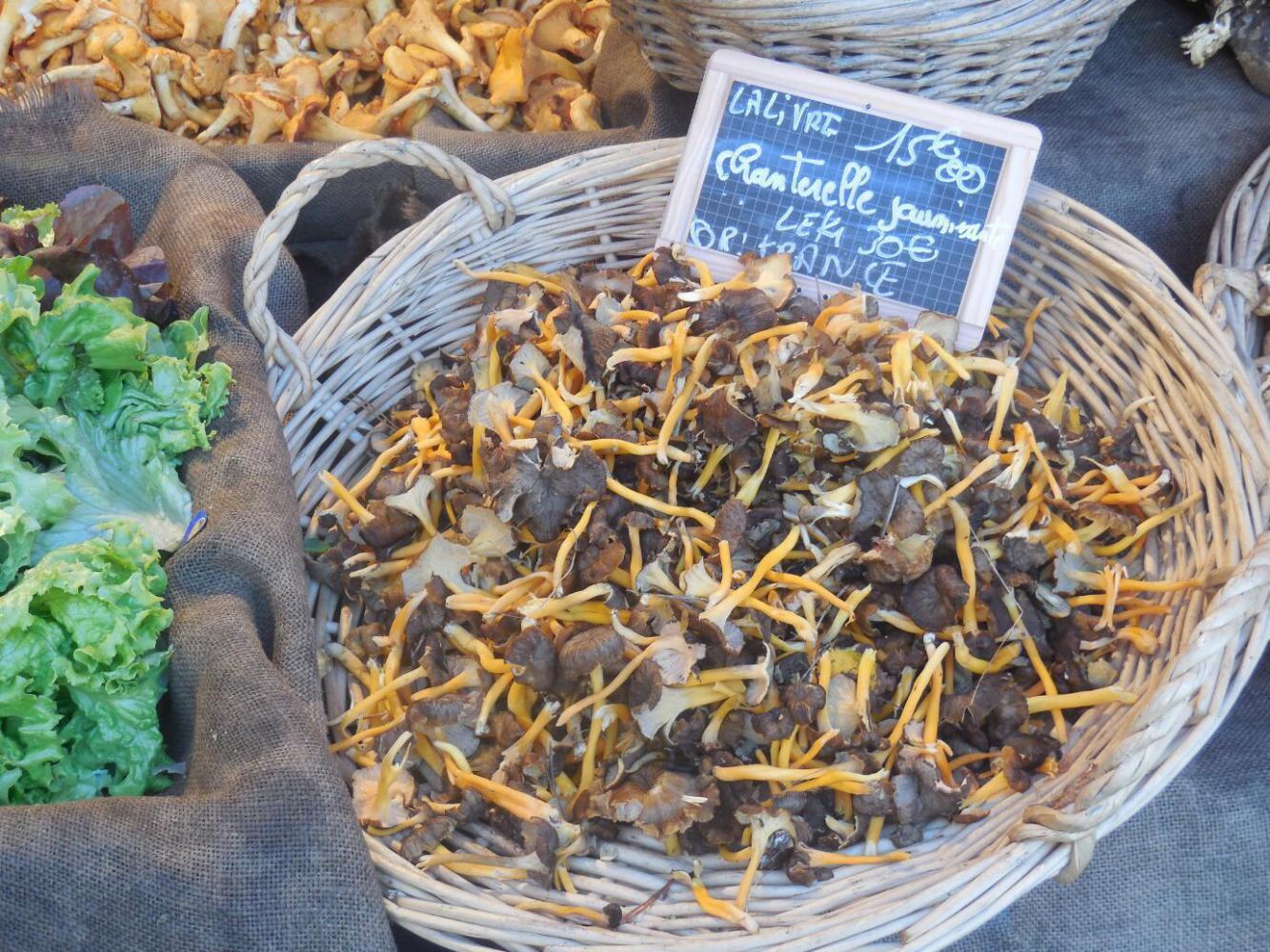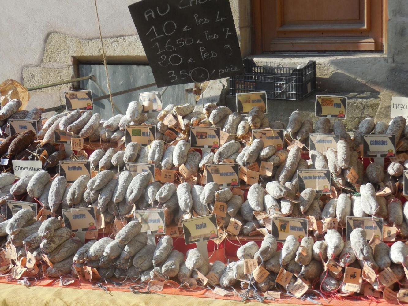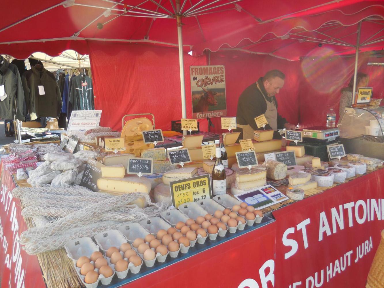 The first thing that happened in this new sector was that two energetic young men were selling cheese from the Jura, by liberally offereing everybody samples. It was so good, I felt we needed some of this too. The one we got was called Tomyere. Dodie had asked for just a little bit, but she got momentarily distracted by some UQs, and the young man cleverly added a few degrees to his knife angle. The piece came out at 9 euros. Dodie probably would have asked him to cut it back, but he had an ally in me, my approach being that you can never have too much local cheese.