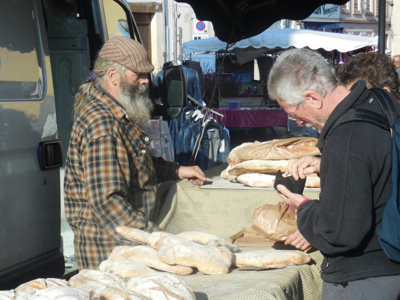 Across the way, a rather grizzled fellow was selling bread, including baguette. They looked nothing like Banette, and he assured me that he made them at home and used a wood oven. So I gave one a try, as a logical followup to the Banette story of yesterday.