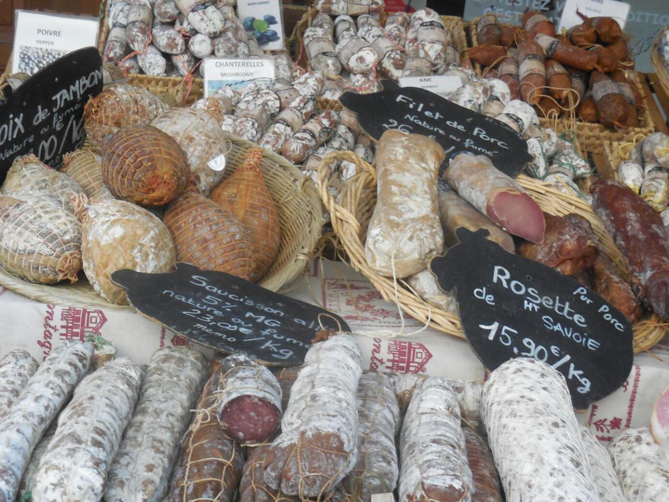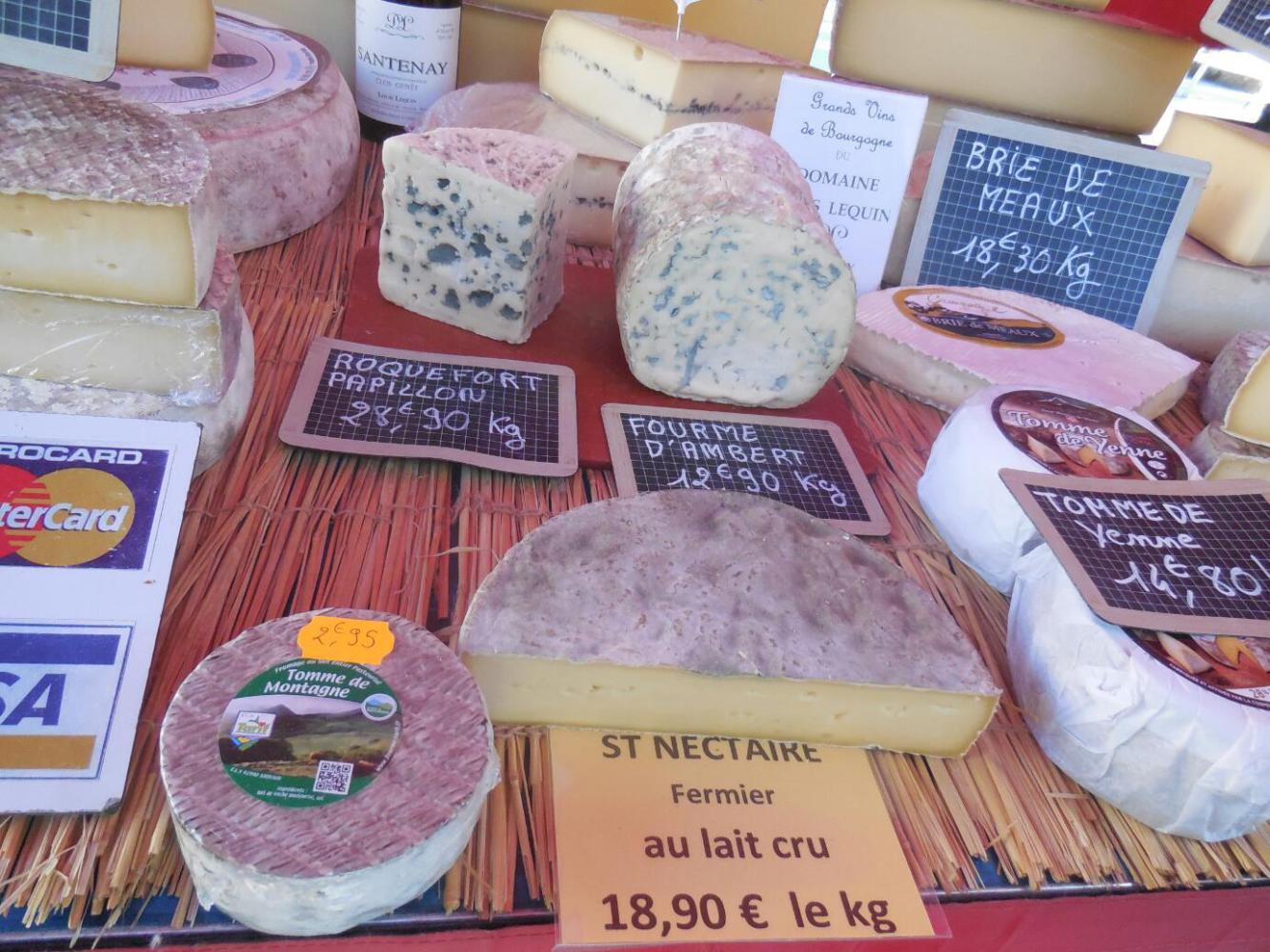 So we snapped up a whole chicken, and some pork! Next, the cheese. The one we had got at Seurre - Compte Doux was much in evidence here, plus others with the Compte designation, like Compte Fruite. I think we ended with Tomme de Savoie, plus some Brie de Meaux, just for fun. I have no idea what any of this means!