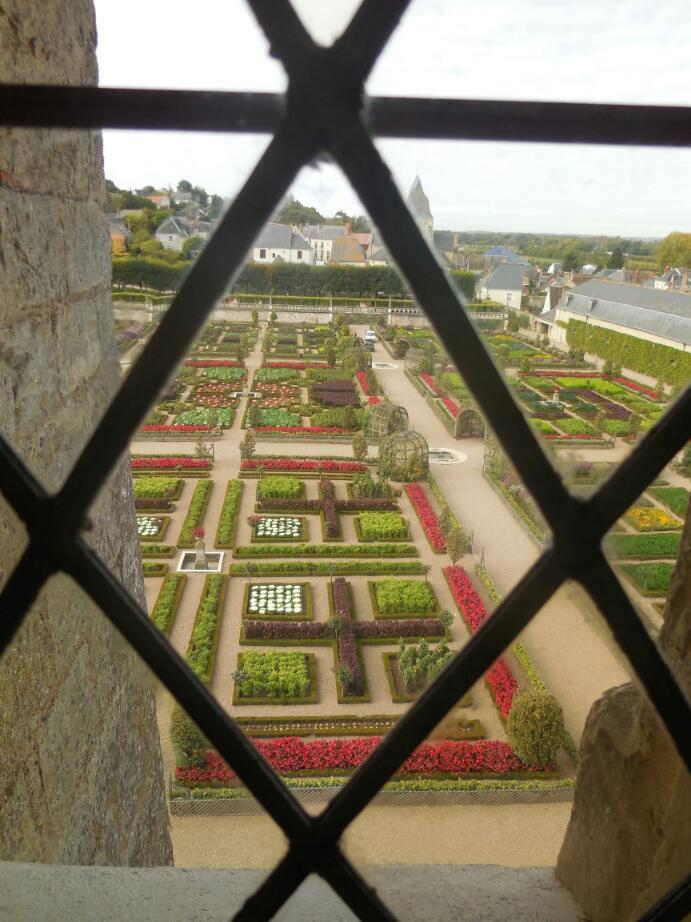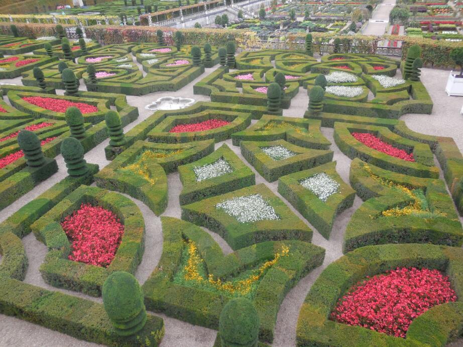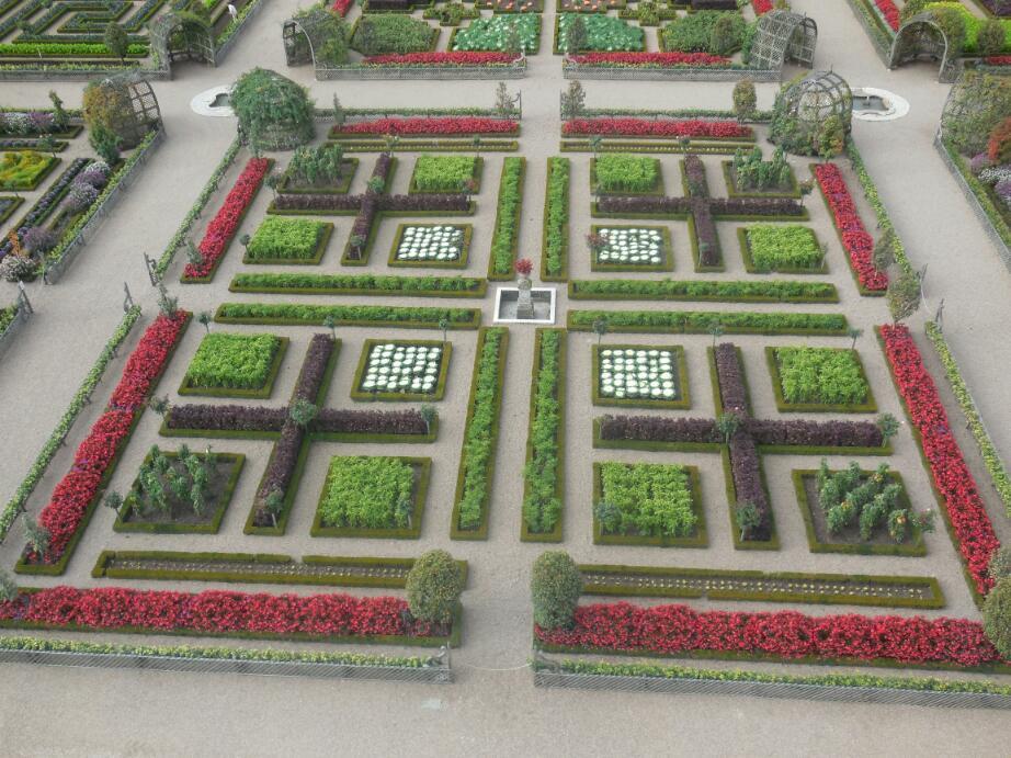 The chateau really has two aspects, the building itself and the formal gardens. All chateaux have gardens, but Villandry really is something else. We started with a look at the gardens, while waiting for a guided tour of the building to begin. It was a bit of a problem because though we had a nice pamphlet showing everything, it took time for the garden layout to sink in. It turned out that the first twenty minutes of the guided tour explained the garden layout, using a large scale model.