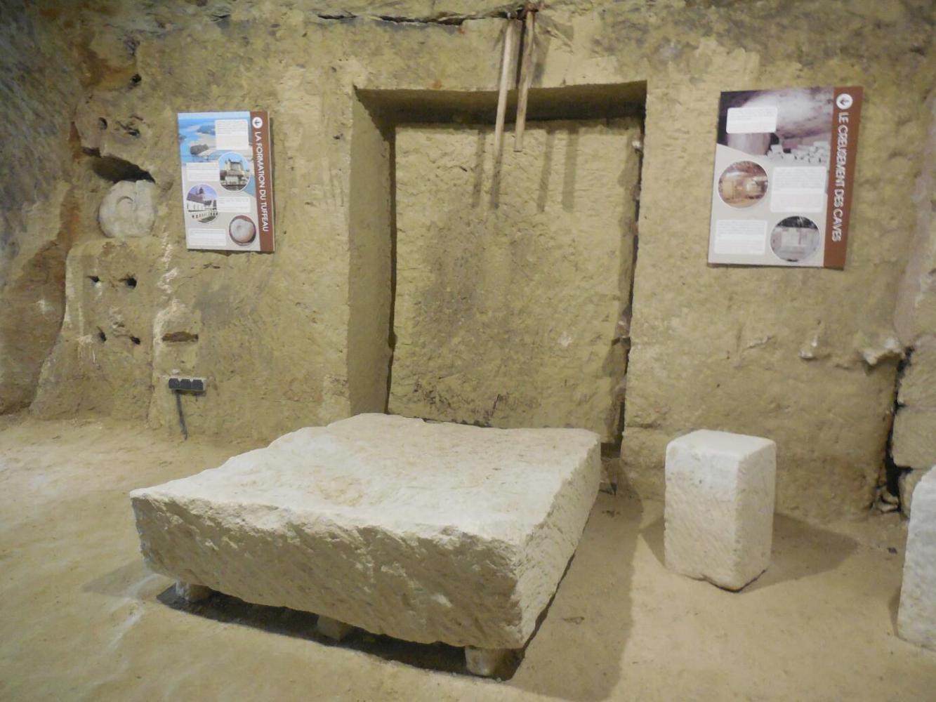 The site is clearly a former tuffeau mine, and goes way, way back into the mountain. Tuffeau is the soft limestone that gives all the villages hereabouts their classic white and crumbly appearance, and that was used to build literally all the chateaux in the area. The mushroom museum (like the cave the other day) has a demonstration area showing how tuffeau was cut out of the wall and allowed to fall onto "pillows" of stone, before being cut into chateau building sized blocks.