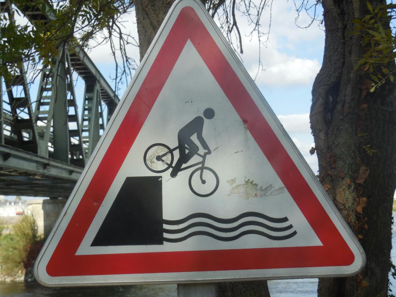 So, we turned and began to trudge back. Clearly we were not going to Angers, or maybe anywhere much, in the approaching evening. However after a bit the slope eased, and Dodie saw a traverse she could get up. So up she went, and I followed in several trips with the bikes and gear. Now we were on our way - except for it being along a 3 km grass track! And oh, that bridge was a bug. La Loire a Velo provided a nice sign before it, it said "Warning, you arrive on a way at high traffic, are all eyes!". Thanks!