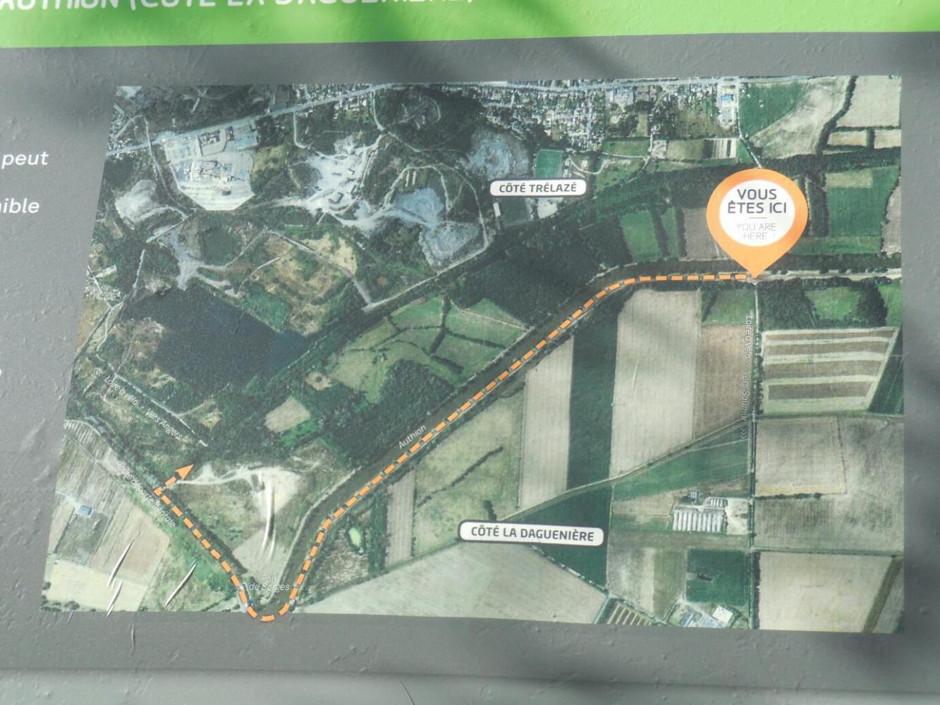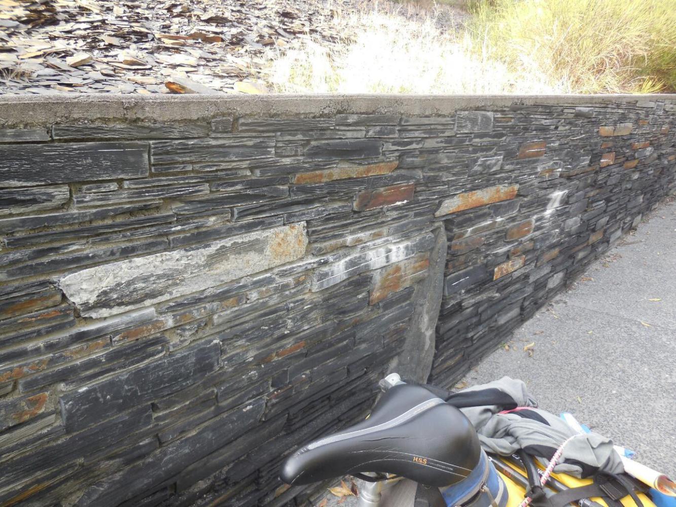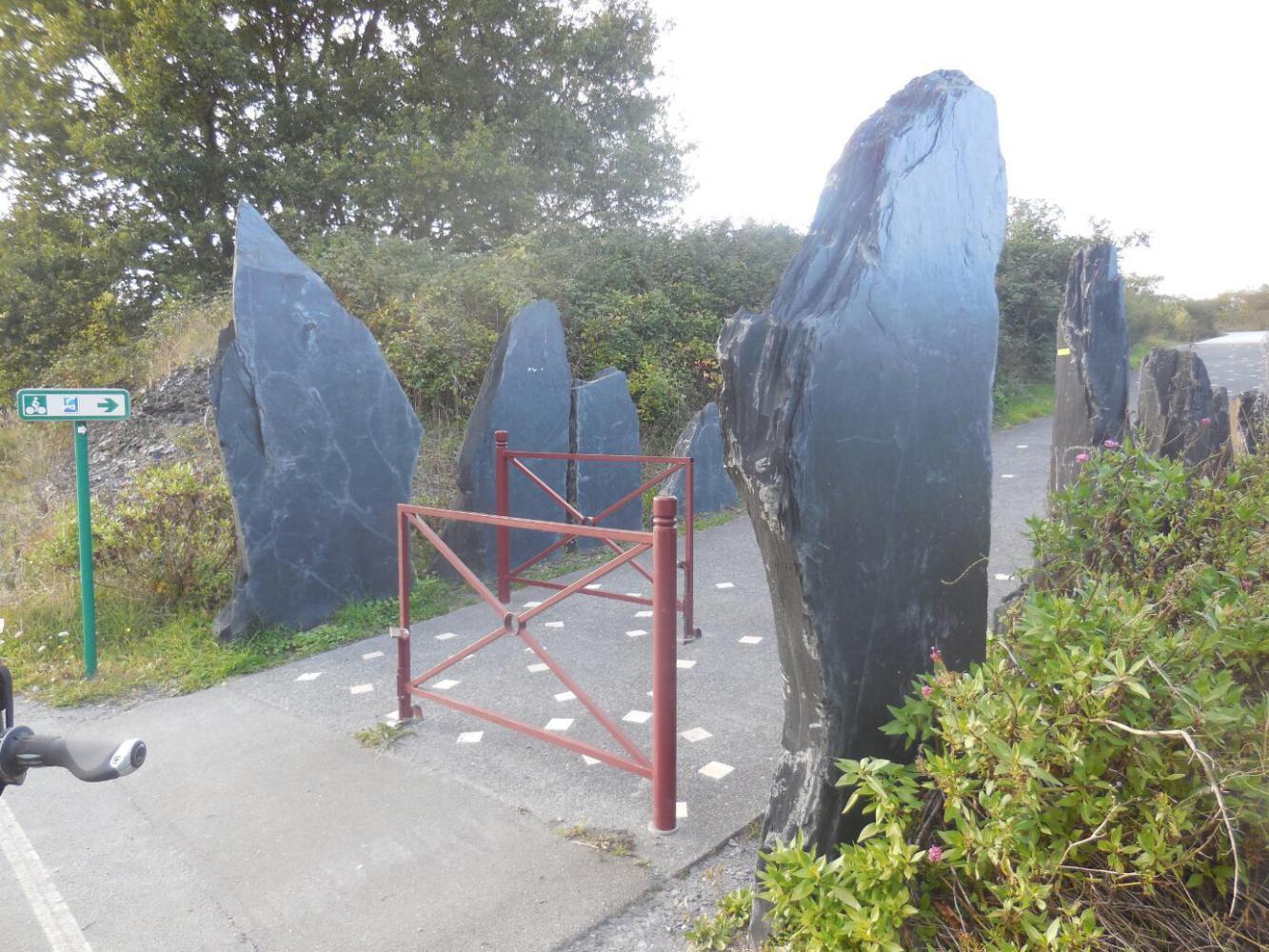 On the other side of the bridge, we quickly entered something called the Parc des Ardoisieres. So here was the heart of the Angers slate thing. Ardoise is slate, and it is commonly used for roofs. Clearly (and from the illustration) an Ardoisiere is someone who chips out roofing tiles. We passed mountains of slate pieces, probably waste from the quarries. There were also larger blocks, some set up as benches. I was surprised to find that the stone was warm, even in this coolish day, and pleasant to sit on, as we searched Booking for a place in Angers, which now we were clearly going to reach.