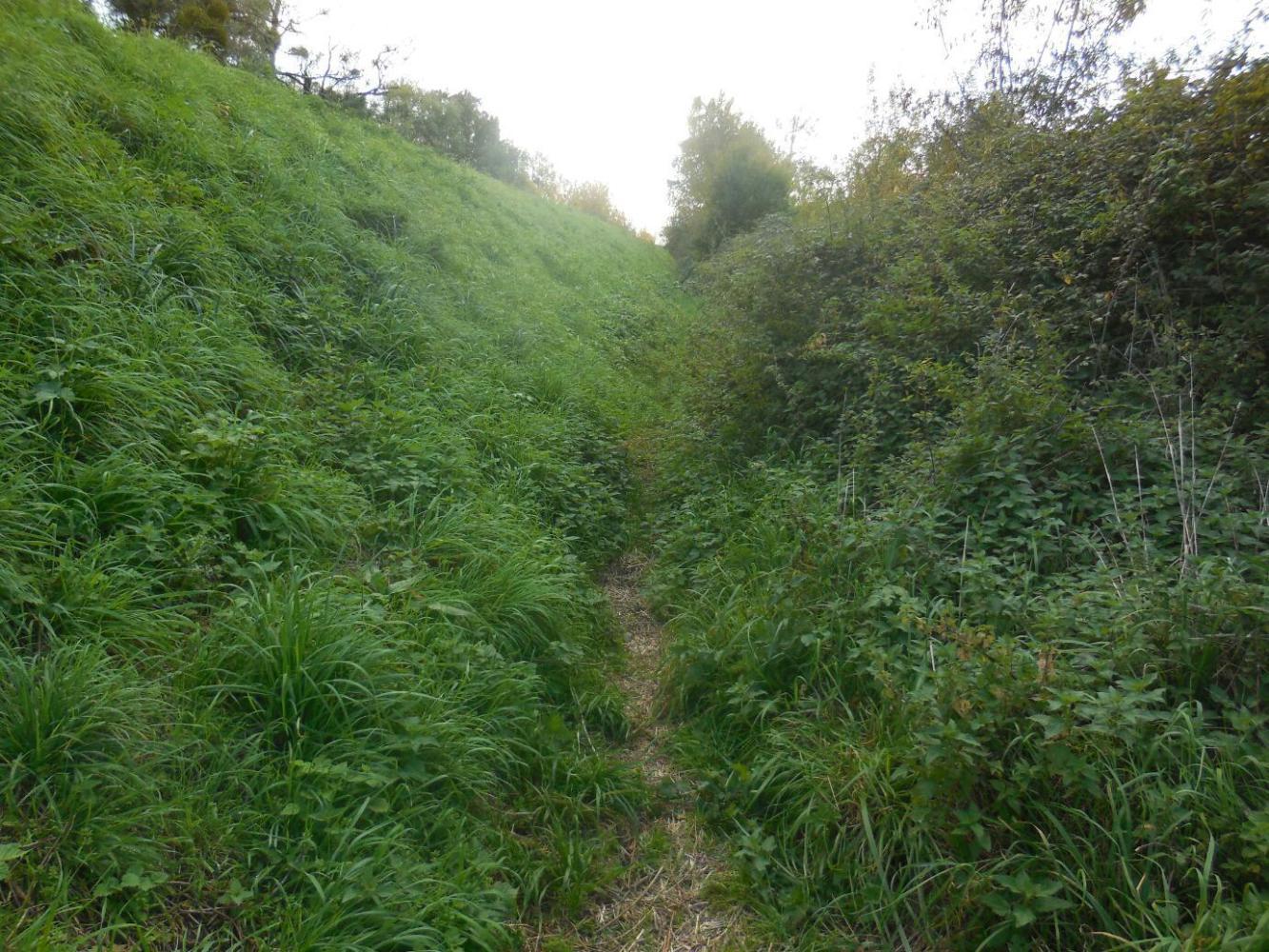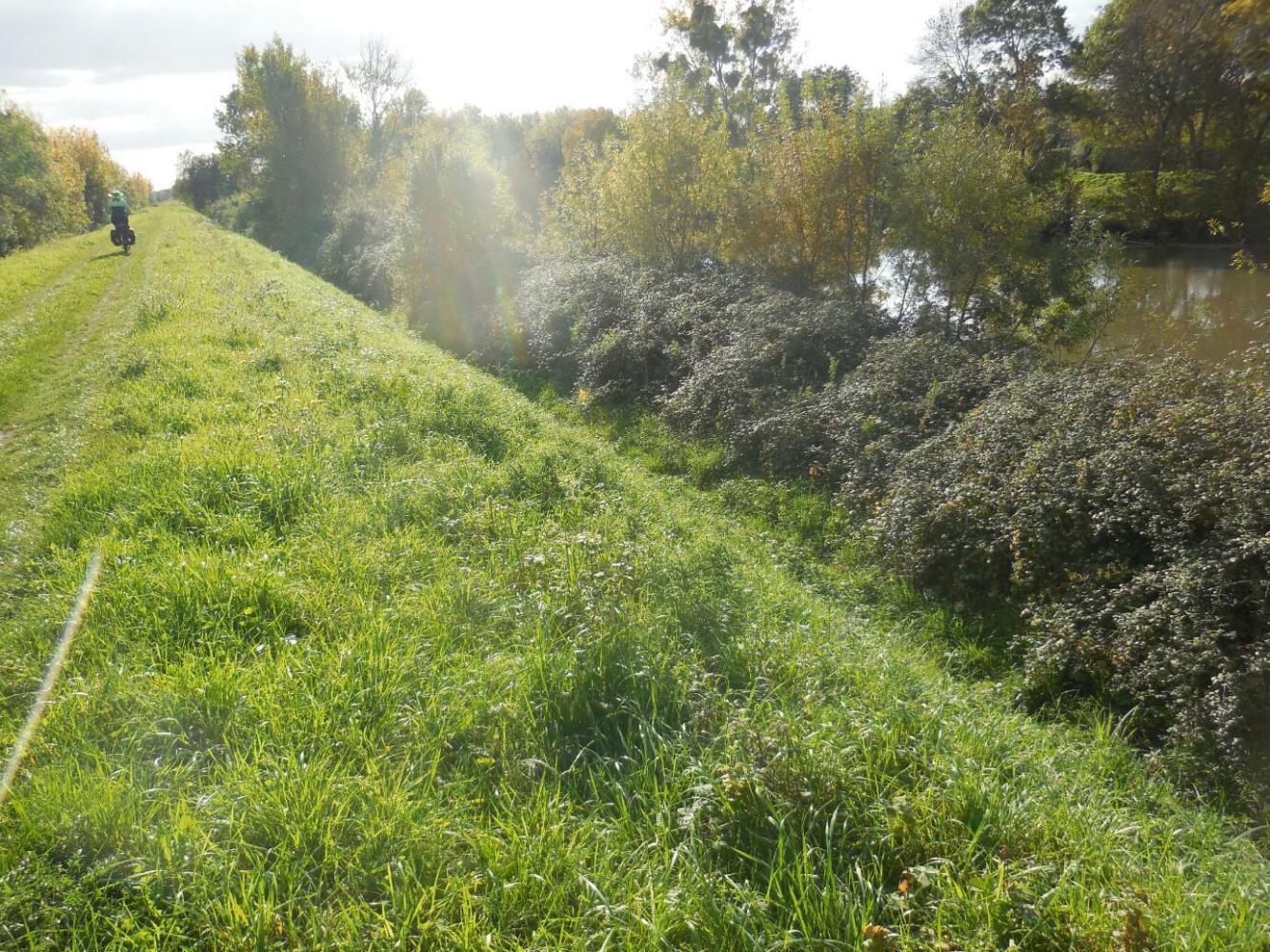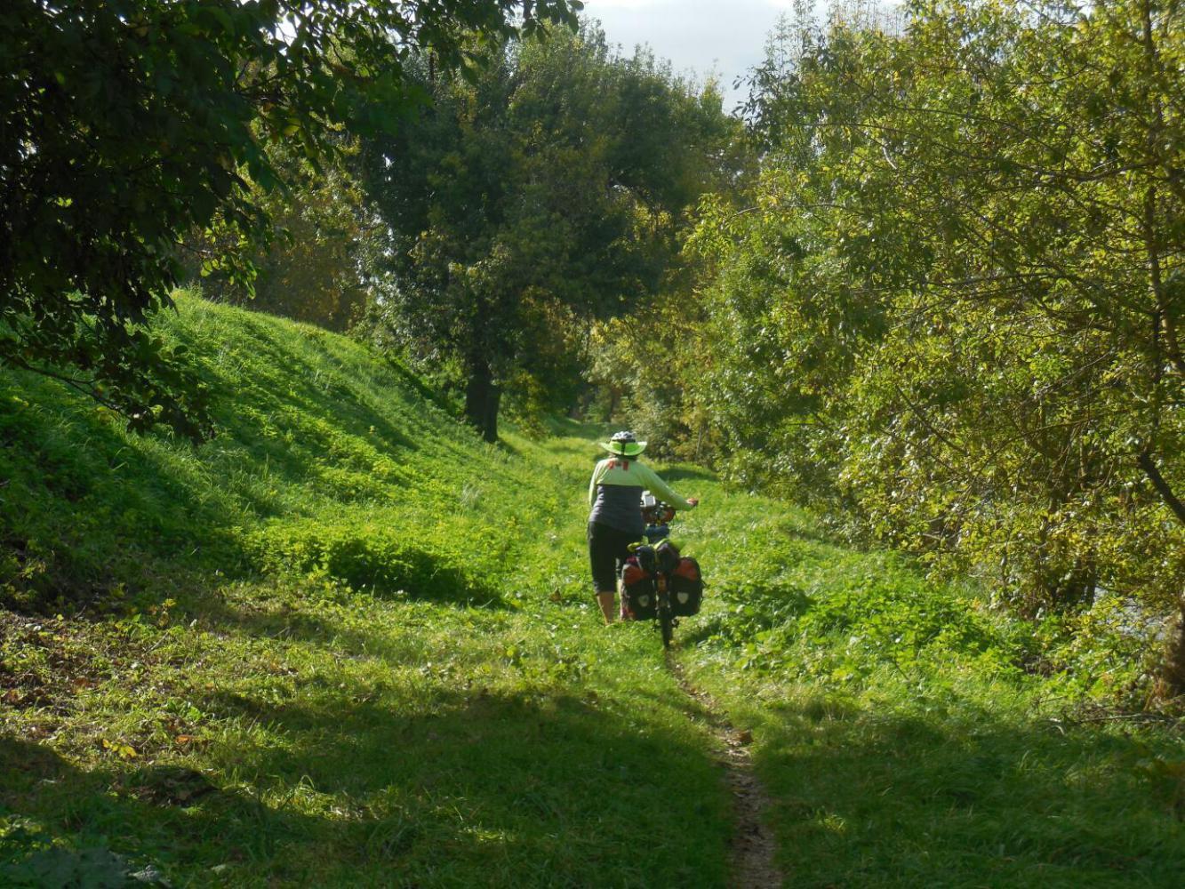 But, no problem. The former track was running beneath a dike, with a grass track on top. The only thing, "beneath" means that the dike was a semi-vertical wall. I climbed up, grabbing the grass and nettles, to report on what was up there. I claimed I could carry the bikes up, if mostly unloaded, but Dodie tried and declared the climb too hard for her knees.
