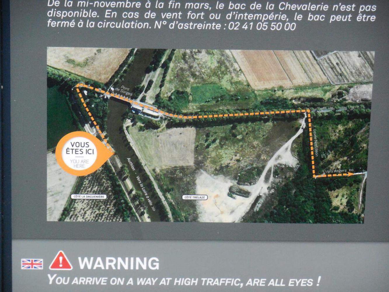 Well I hate backtracking, so I insisted on the direct route to Angers. Dodie accepted, and we set off. Very soon we came to the river Authion. At the Authion la Loire a Velo has a little surprise. The river is to be crossed with a little ferry. The ferry is floating a bit offshore, and no one is around. No problem, there is a sign. It says (effectively) the ferry is operating, but if there is a problem phone a hot line number at the Mairie of the nearest town, La Daguenaire.