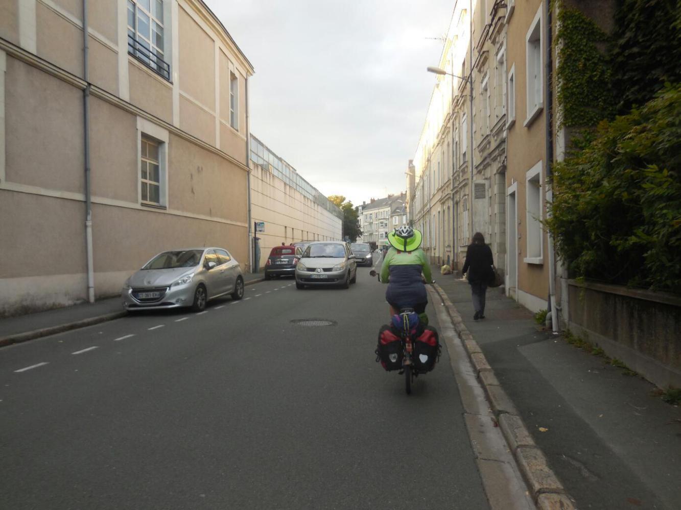As we came in to Angers, La Loire a Velo led us along a road that was quite narrow and only sporadically marked for bikes. But the town began with an aggressive sign that I liked a lot. It said basicallly "This town belongs to people on foot and on bike, the speed limit is 30 kph, got it?". Later there was another similar sign, on the street with our hotel. It said basically "You are entering the heart of a city. Pedestrians, bikes, cars - share the space! (Speed limit 30 kph.)"