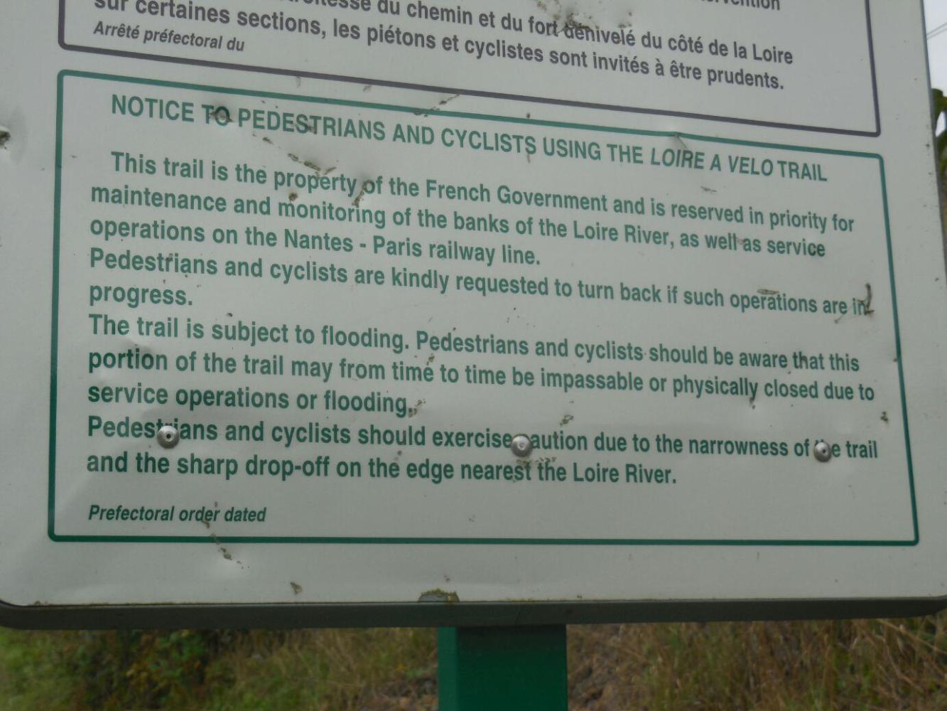The Loire in this area is quite popular with walkers and cyclists, and we were intrigued to find two new signs. The first was a variant on the "Share the Road" series, except that this was "Share the Path" - cyclists and pedestrians. We rather enjoyed being the vehicle with the upper hand for a while, and we liked the sign's portrayal of the cycle starting off by apparently getting ready to knock off a pedestrian. The second sign contained some general cautions, but saved the zinger for last. Watch out for falling in the Loire!