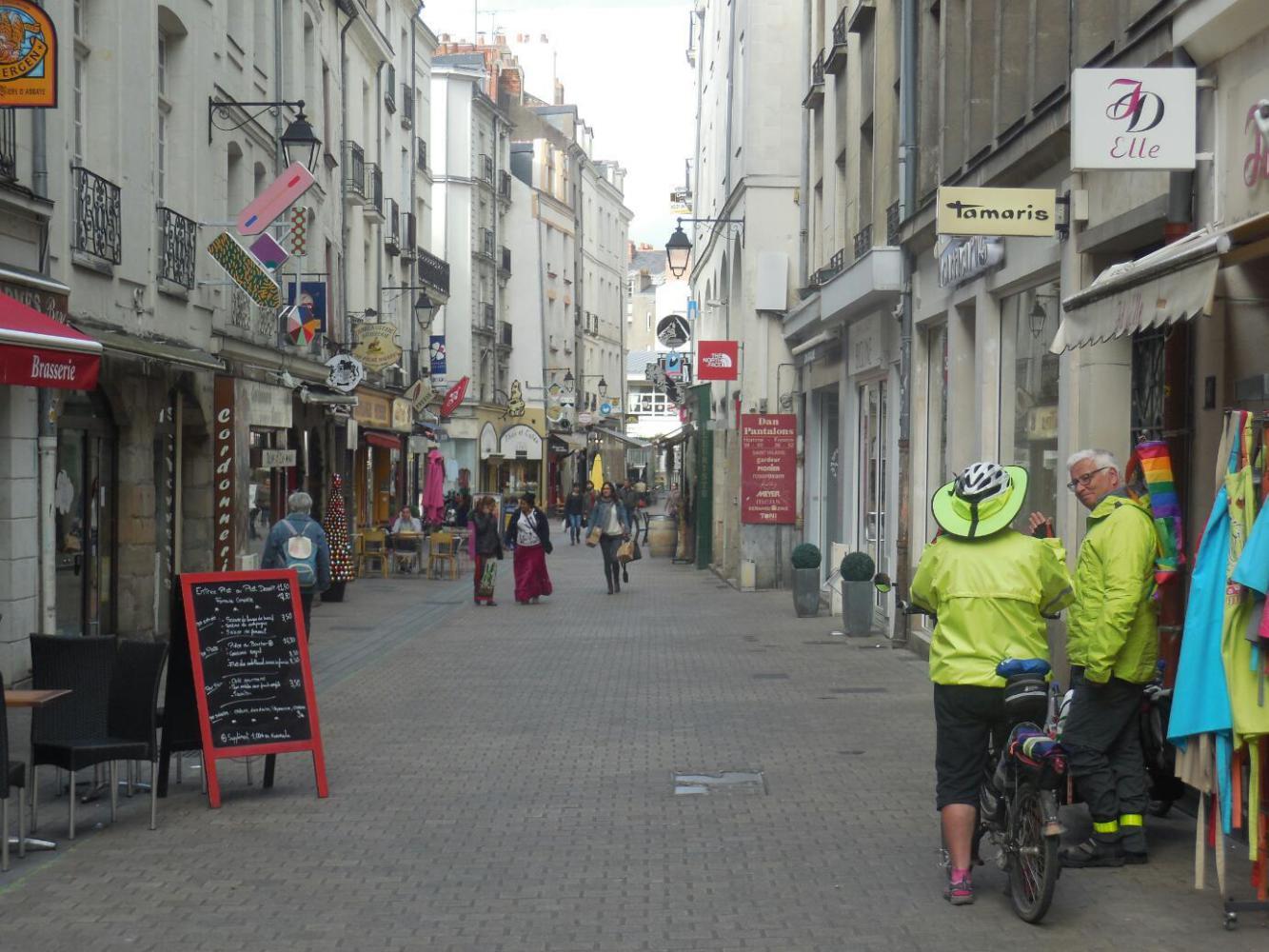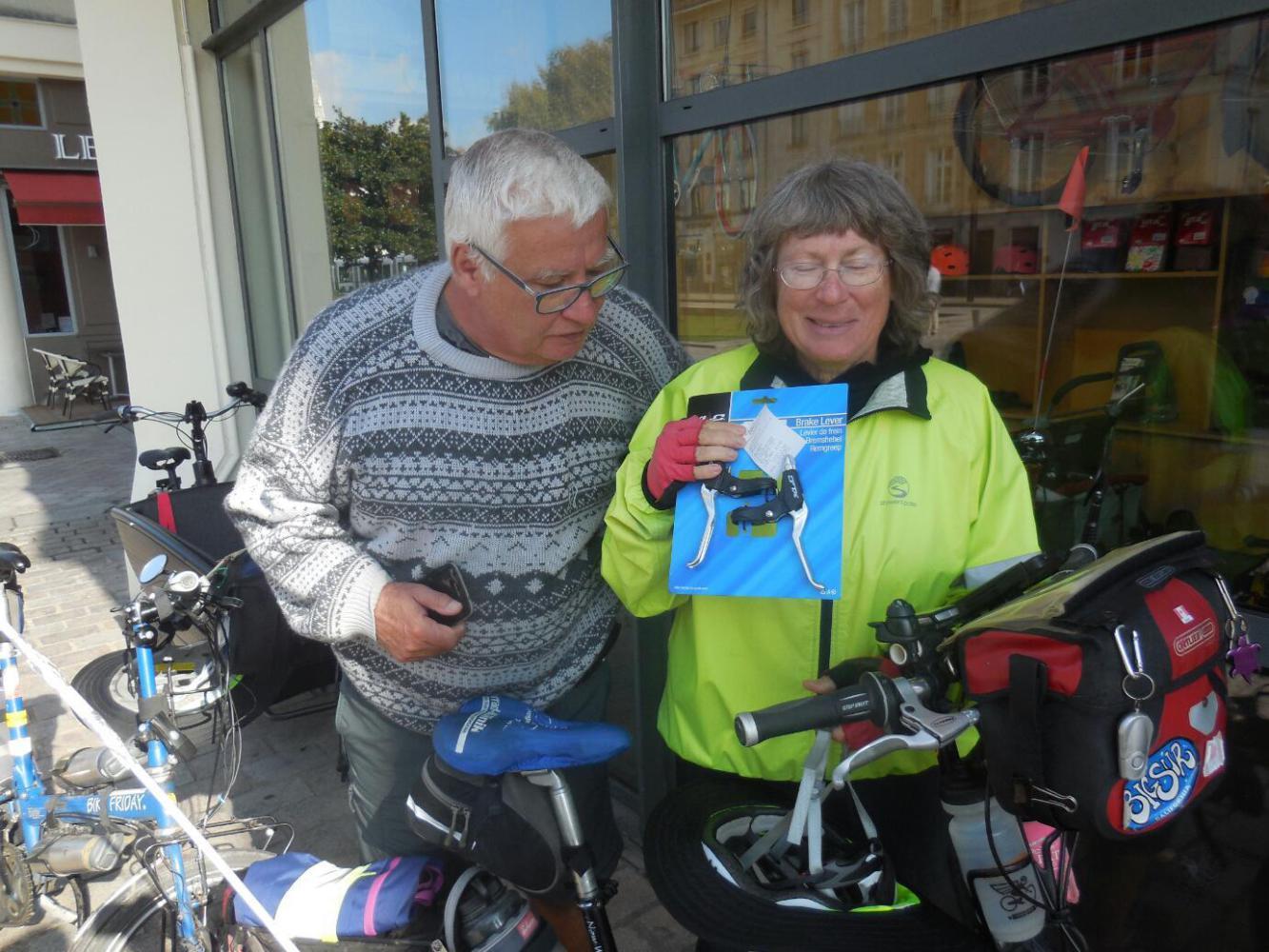 The next thing we ran in to was not exactly a landmark, except for Nantes bicycle enthusiasts. It is the shop called Bo Velo. Here you find those nifty Dutch bulk carrier type bikes and also a stunning display of Brompton folders. Dodie got some new brake levers (since one of hers mostly died when her bike fell over sometime on this trip) and she was really happy about it. The new levers will not make their debut until next trip, though.