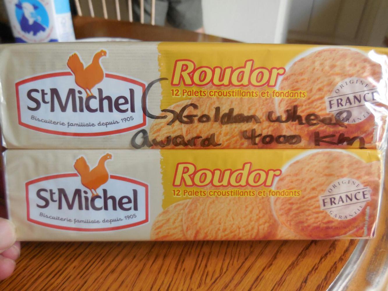Well, 4000 km may not be the greatest for a three month tour, but it is something. Michel helped us feel good about it by giving us the "Golden Wheel" award. This took the form of two packages of cookies from the biscuit factory in nearby (64 km by bike) St Michel Chef-Chef. The cookies are called Roudor, which might certainly be translated as golden wheel.