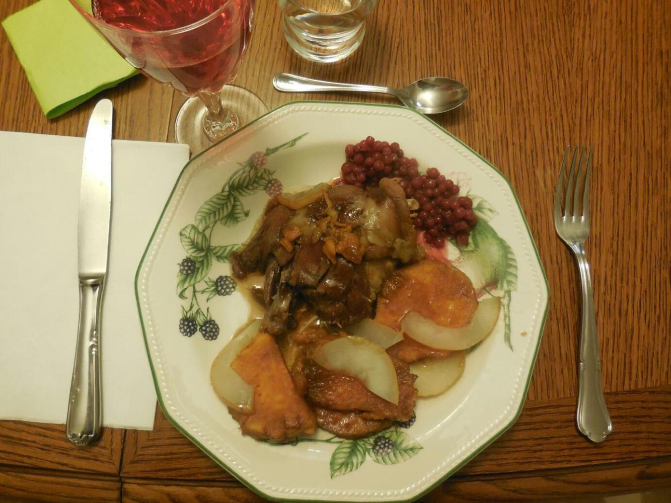 Yesterday, while we were aware that is was Thanksgiving in Canada, we were kind of too busy to do anything about it. We had jokingly suggested to Michel that he should go out and shoot a turkey. He went part way on this, finding sweet potatoes, cranberry juice, and cranberries. So today we acted on this, as much as possible in France. Michel cooked a canned duck - which turne out amazingly well and tasted a lot like turkey dark meat. And Dodie prepared candied yams. The brown sugar needed for this was actually found in the house, because Michel's American wife (Jeannette - currently visiting home in Colorado) uses it for chocolate chip cookies! Overall, it worked. A day late and 8,000 km out of place, but still good!