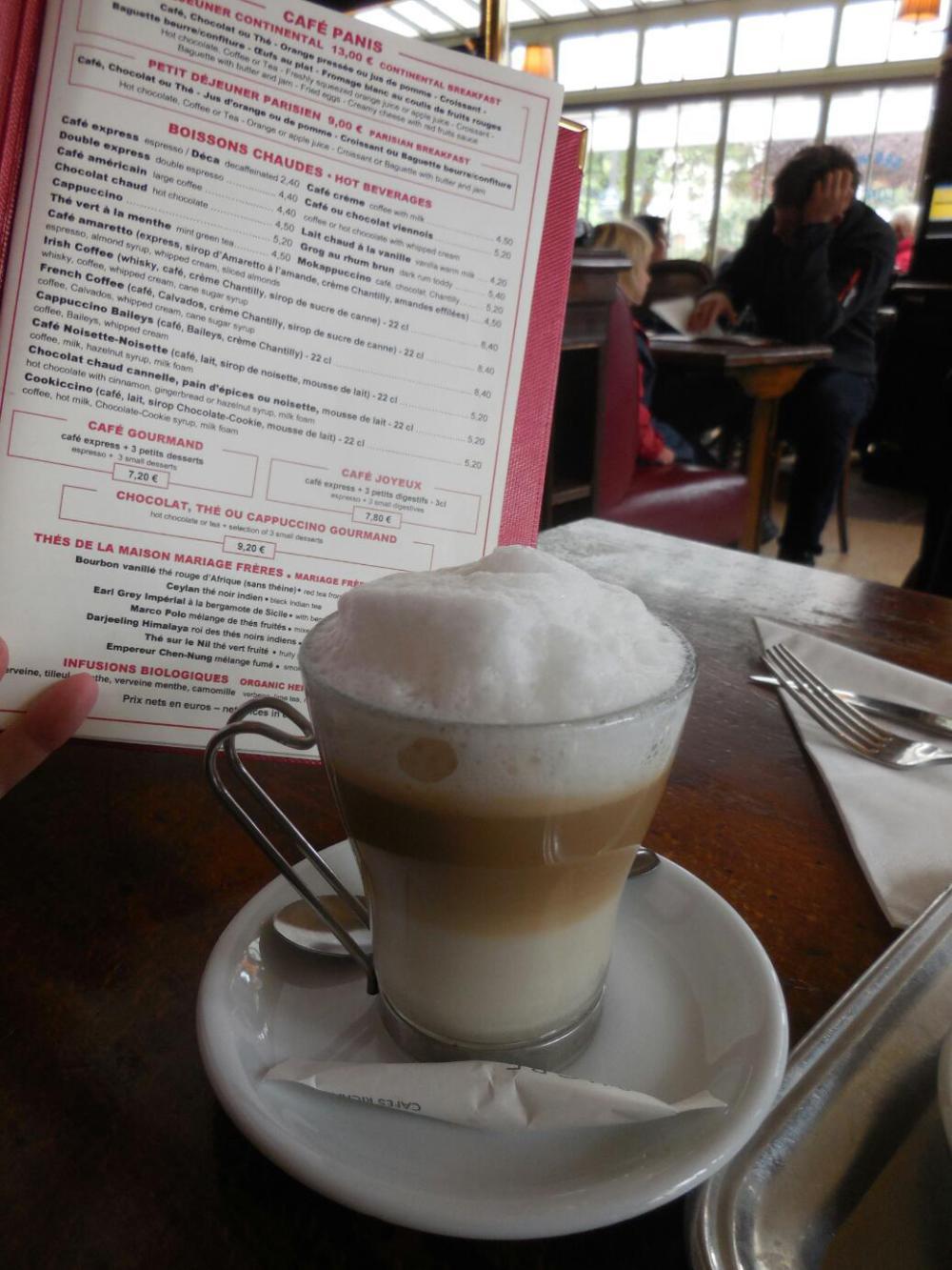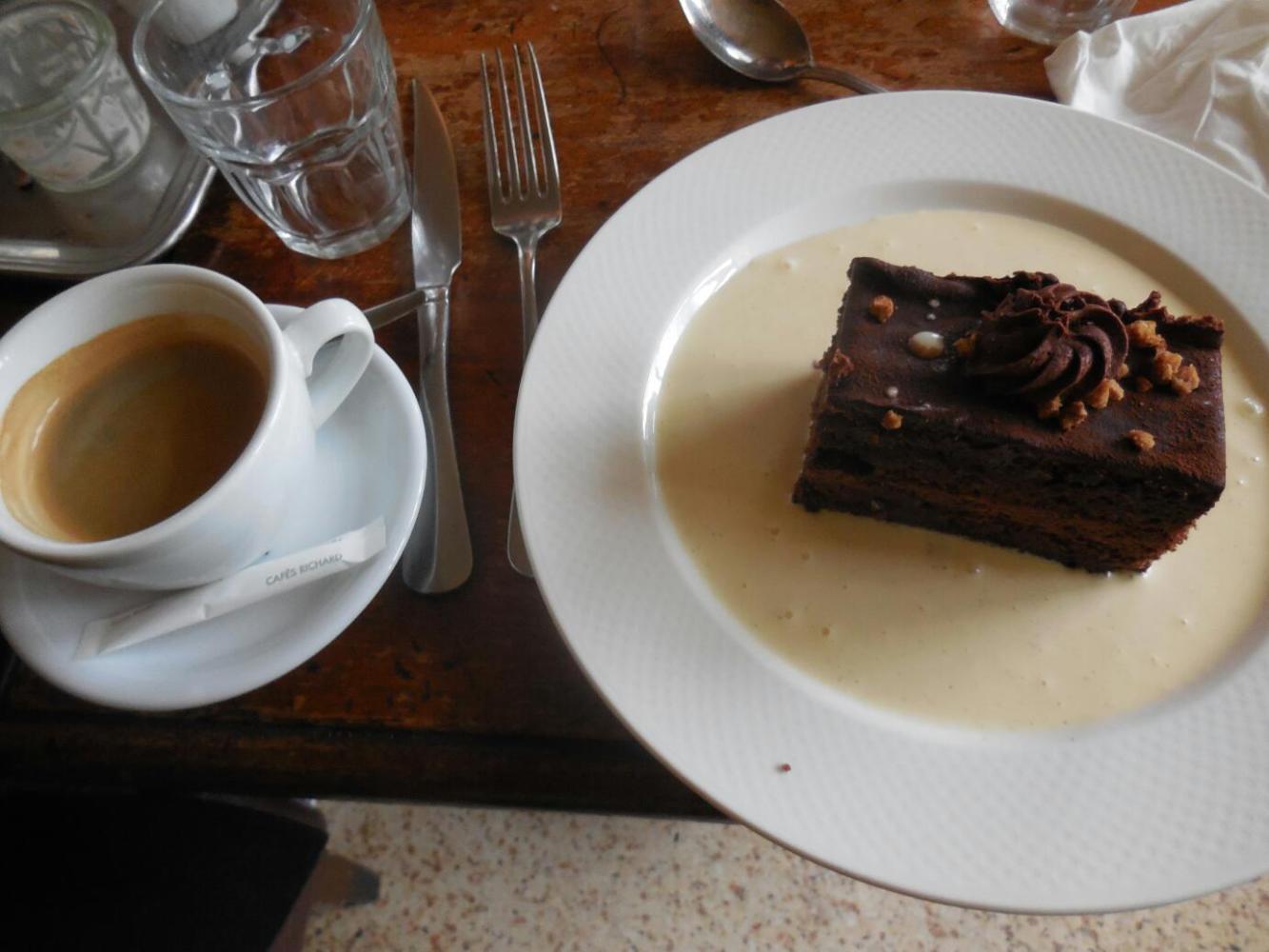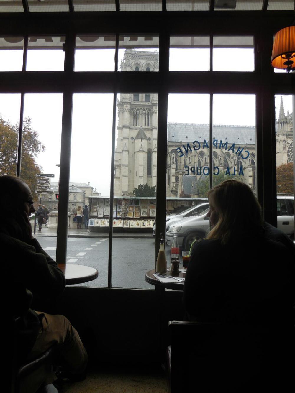 We used the Hop On Hop Off to carry us to Notre Dame Cathedral, or at least to a cafe just opposite. Once again, we were hungry and shivering when we took our table. But oh, there was the wonderful atmosphere of a real Parisian cafe, and with Notre Dame visible beyond the window. Before we chose any food, Joni had the waiter bring a "Cafe Gourmand", which by tradition in France is a coffee with three small pastries. It was really great - I know because Joni kindly shared.