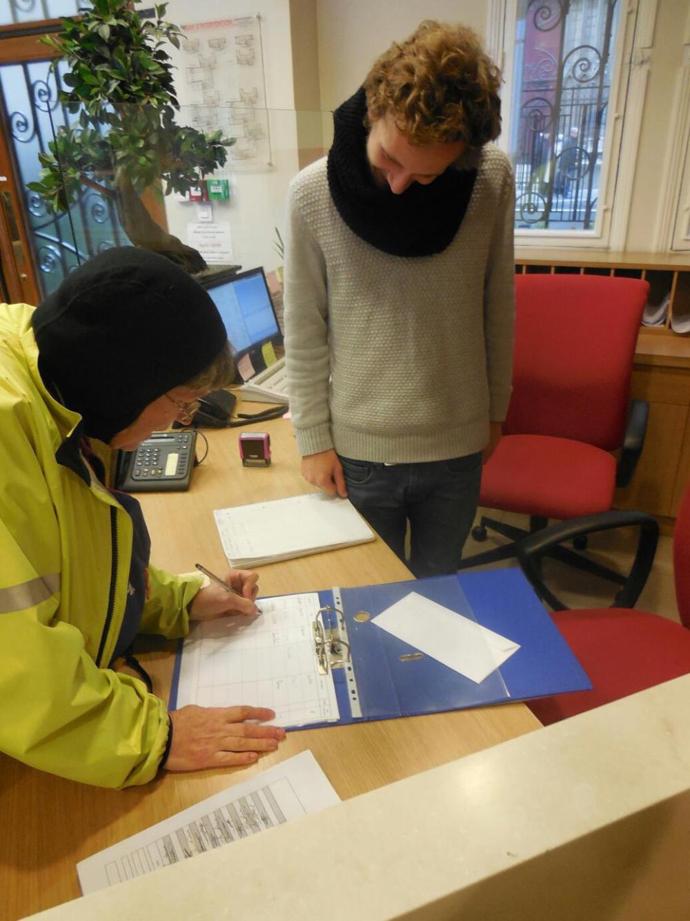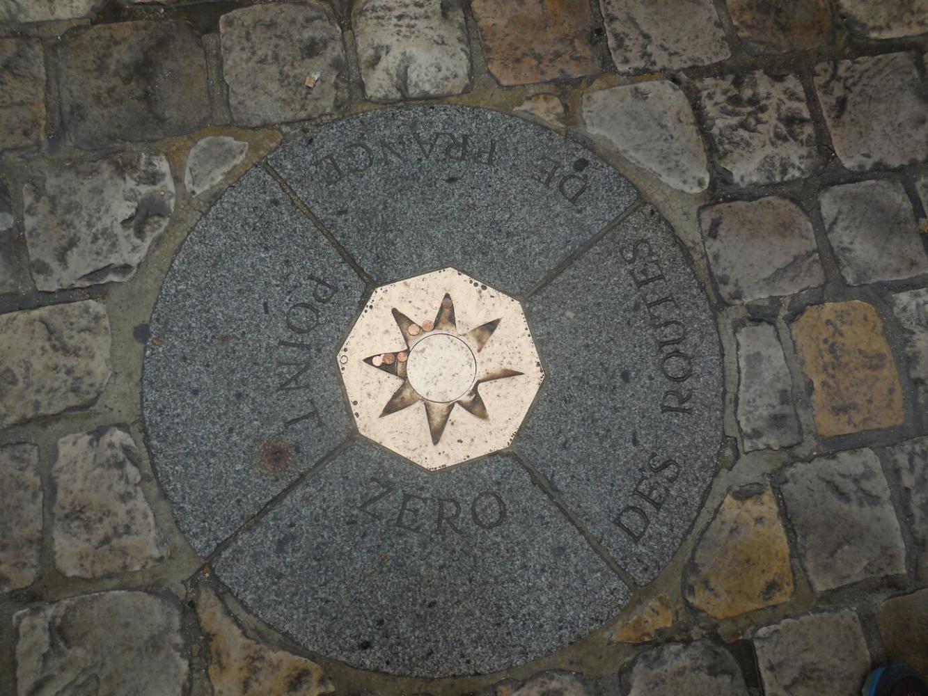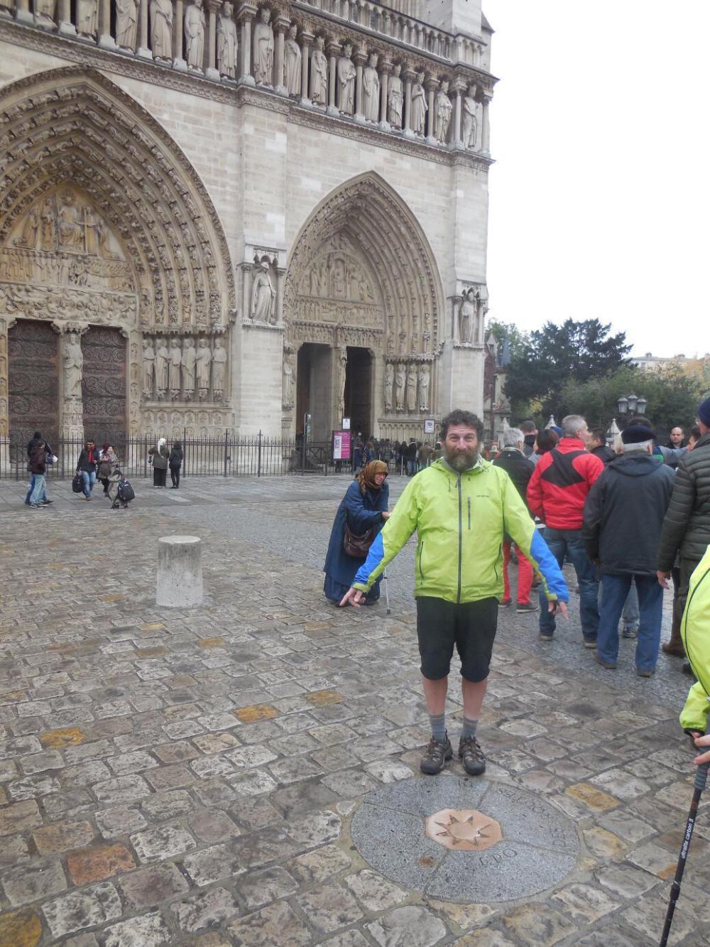 There was only a small line for getting in to Notre Dame, though we saw that by the time we left it had grown considerably. They get on average 38,000 visitors daily, but the place is so big (and the weather so cold) that this day the visitors were fairly well swallowed up inside. While it is true we just sort of automatically visit the cathedral in any town, we had a special reason for coming to Notre Dame. While we had already in Tour received a "Credential" for the Santiago de Compostella (St Jacques Compostelle/ Jakobsweg) pilgrimage to Spain, we figured a second one (since we are two) would be a good idea. Also, Ground Zero for such tours in France is marked by a brass disk in the ground outside Notre Dame.