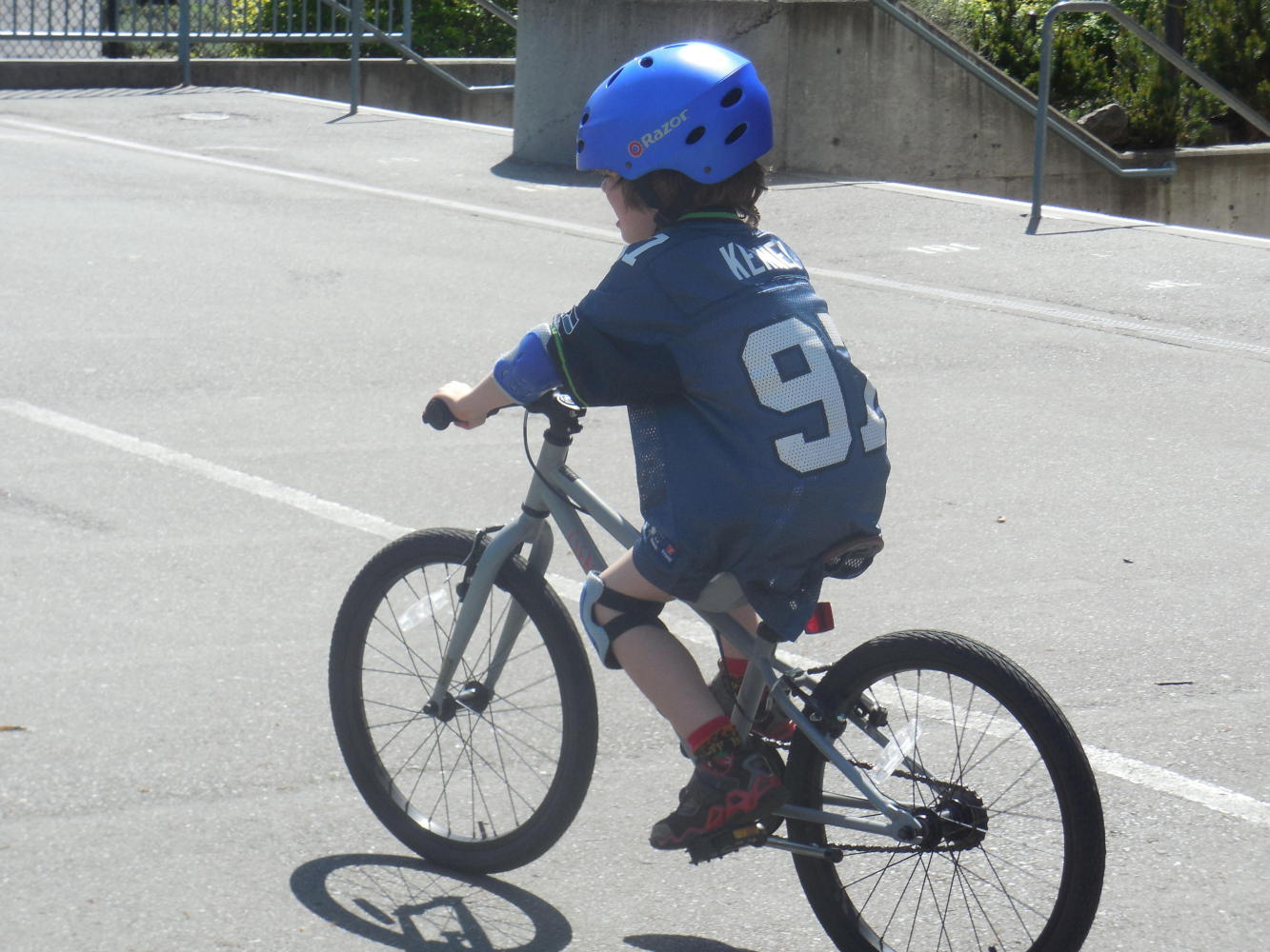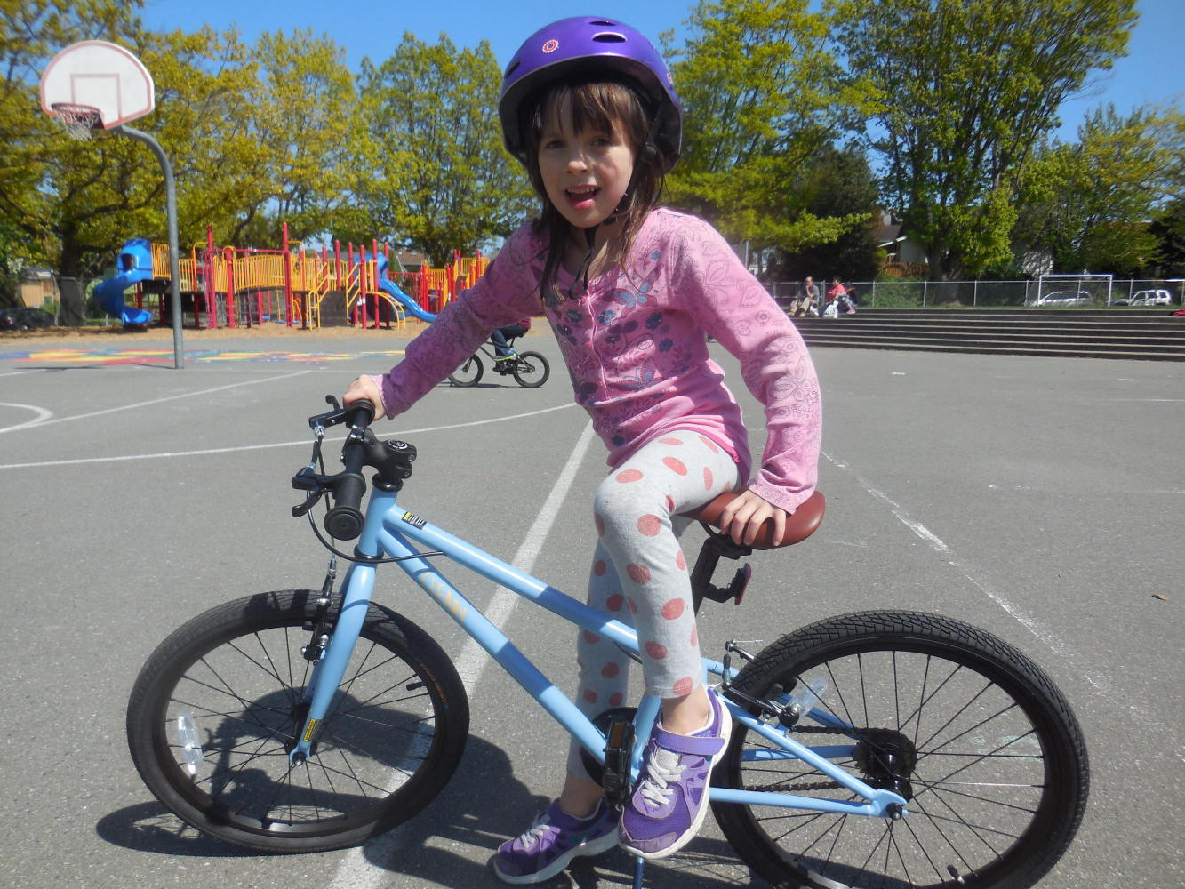 Evelyn is gearing up for her first ride. (Note her tee shirt, which came from CERN, near Geneva. The equation shown is the Standard Model Lagrangian (of course).