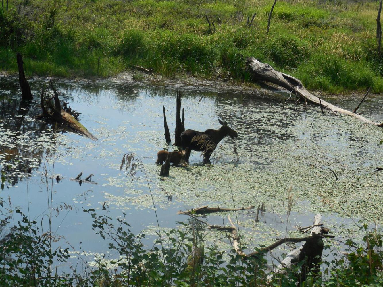 One thing Europe can not offer, though, was standing in the water right beside the trail as we returned from the Mission. Not one, but again, two Moose - again a mother and calf. They were munching up the water plants, just as they are supposed to, and they did not seem too much disturbed to have us there. We were close enough to hear the sloosh sloosh of their legs as they walked slowly forward. Dodie spotted them first, so she has now been promoted to chief moose spotter, a big jump from her former lowly position!