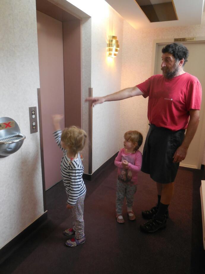 I showed the kids how to work the elevator. Later they ran ahead just a few feet, pushed the button, and the elevator came immediately. It needed a brief sprint to keep them from taking off alone in it!
