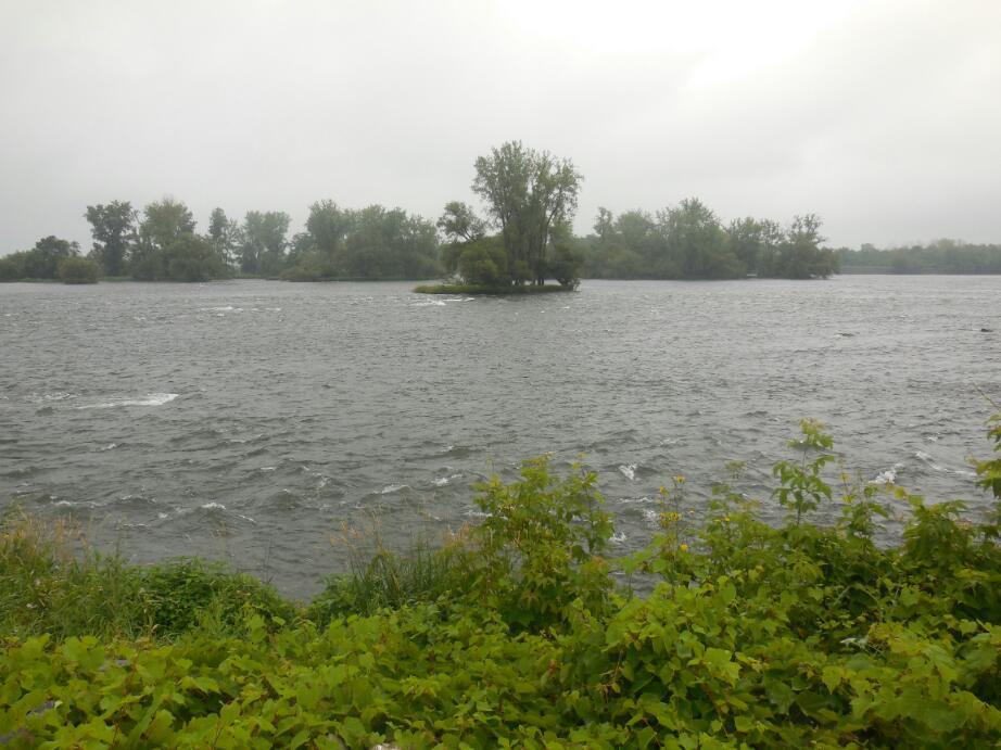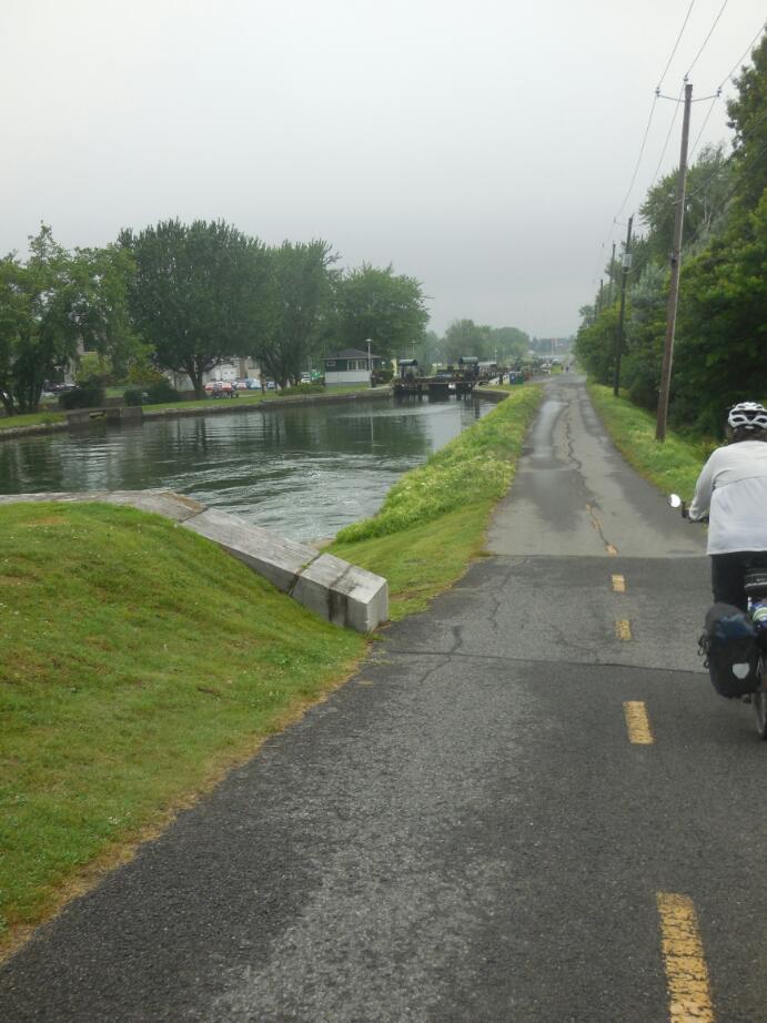 It rained heavily in the night, but by morning we got a break and just had mizzle. This was great, except that yesterday's hard packed gravel trail had now become a gluey gritty mess. The increased rolling resistance was ok, because we were now heading back to Chambly, and yesterday's head wind was at our backs. No, in this case it was poor Evee who bore the brunt of it. To give ventilation in the trailer, we had the plastic front window rolled up, leaving just a screen. But grit and water from the back wheel was spraying up and for some reason targeting Evee. Usually not shy about complaining, our little trooper just sat there until we spotted the problem. Oh well, like mud spattered Avi on the Hiawatha last year, she now had some genuine cycling grit to display.