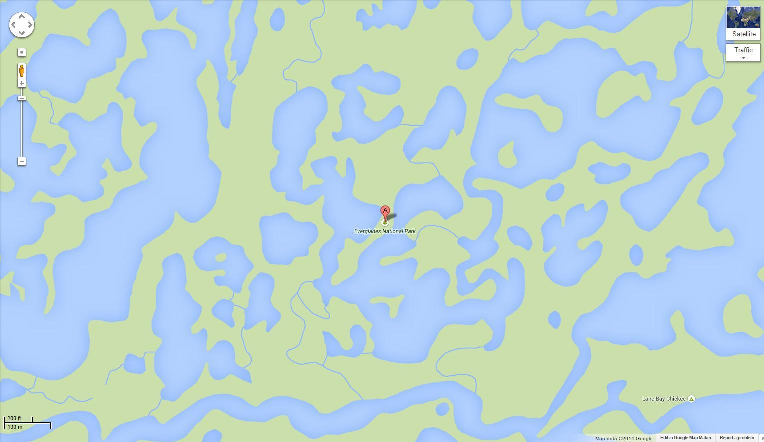 The next "dead end" is the Everglades. Last year we skirted through its northern section by zooming along the Tamiami Trail. But surely the "real" everglades are in Everglades National Park. The road into the park dead ends at the Gulf of Mexico, meaning that you will want to back out. In fact, if you just type "Everglades National Park" into Google Maps, this is what you get: