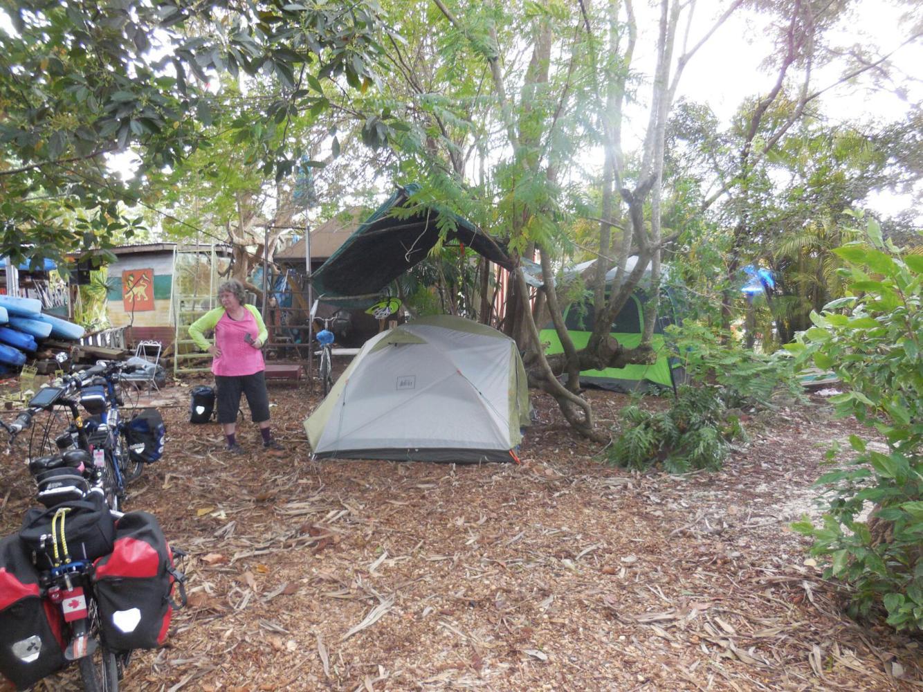 Fuelled up with thousands of healthful calories, we negotiated the remaining 2 km to the Everglades Hostel. This is just the most fantastic place. It occupies a lot right on US 1 and the M Path that is nonetheless very secluded by fences, trees, and foliage. Inside, there is a mind boggling assortment of gazebos, shelters, tent sites, electrical outlets, lounges, and a well equipped kitchen. There are private and semi private rooms, and dorm beds. There is wifi throughout, and one available PC.