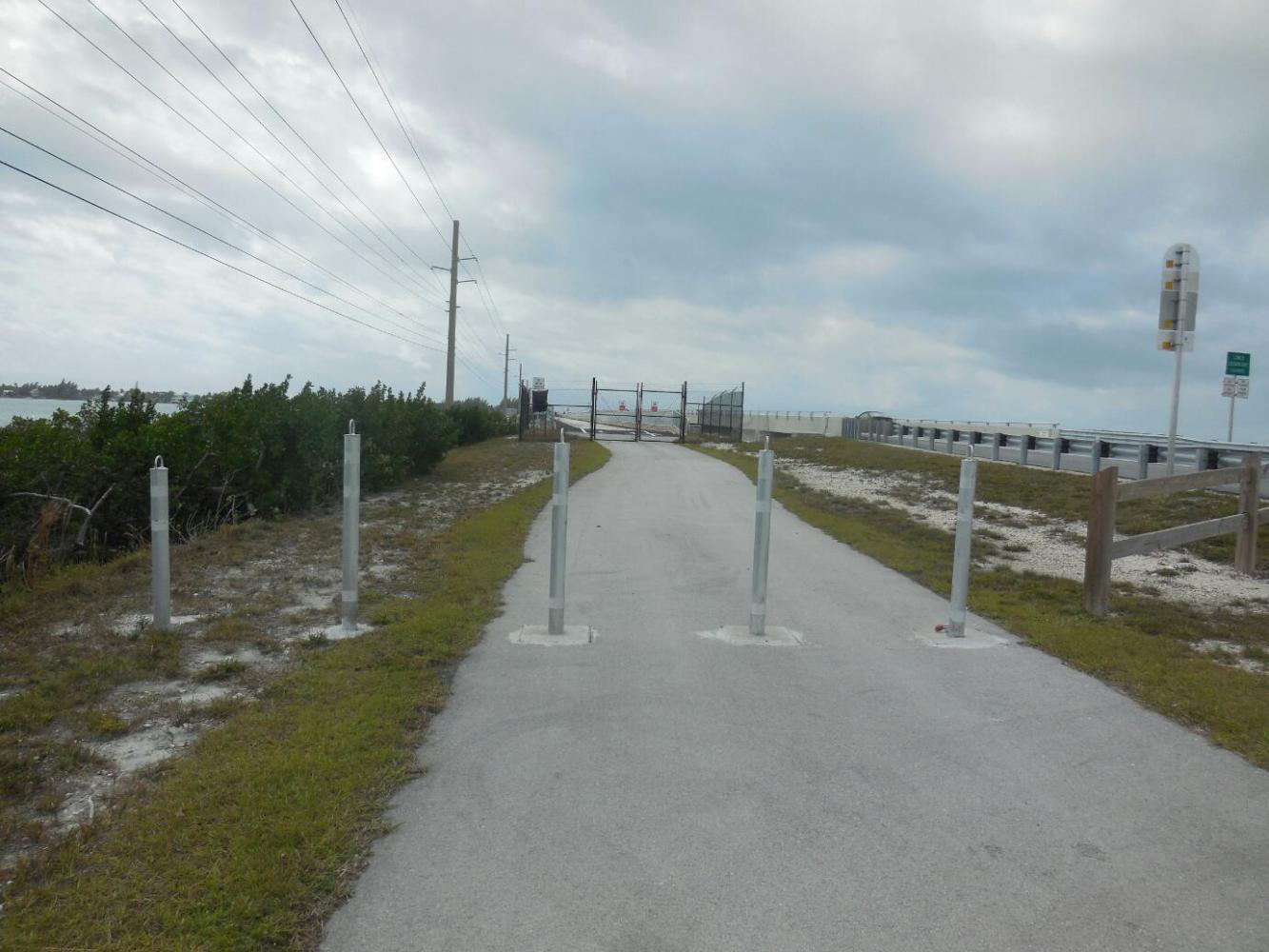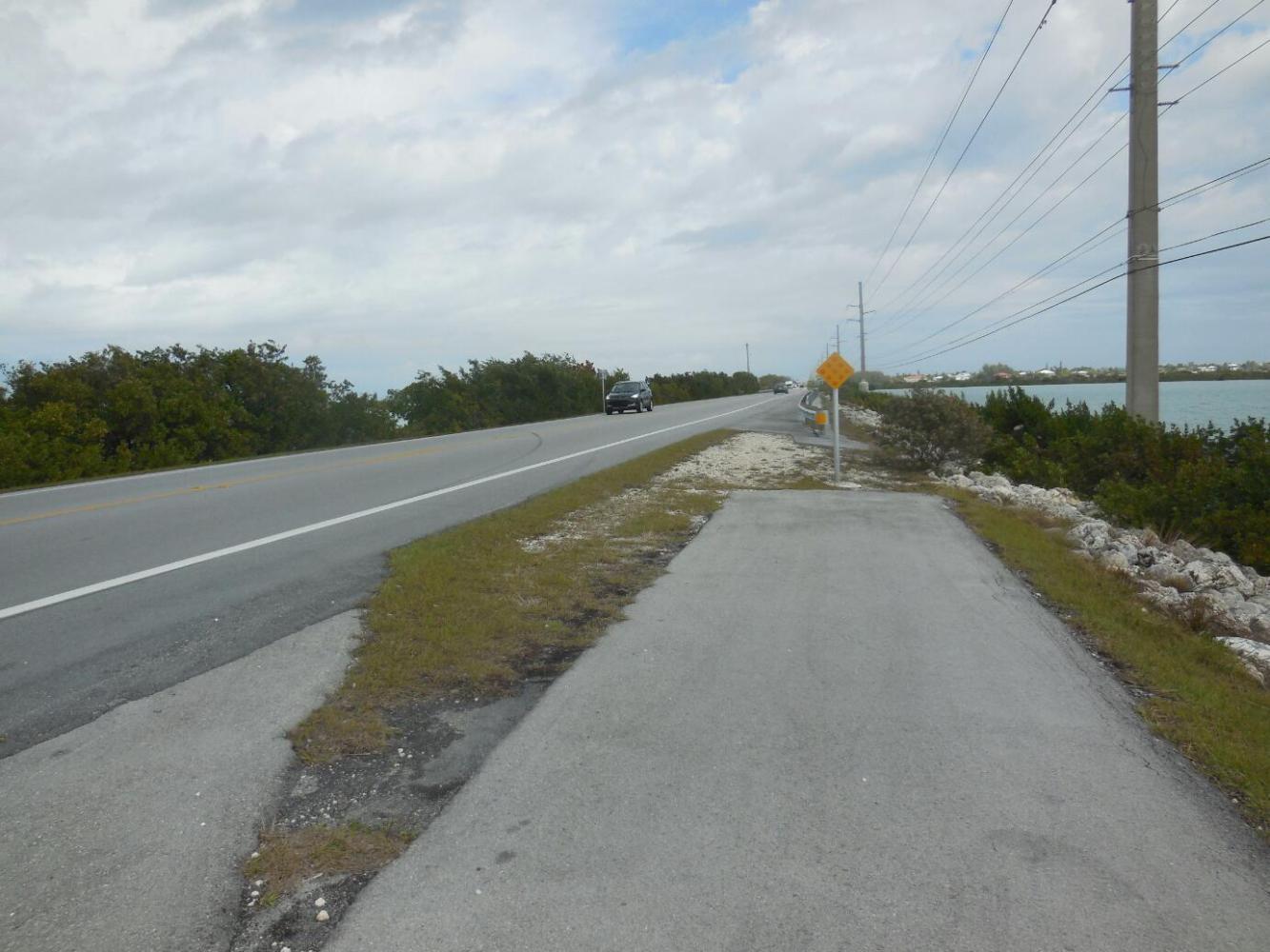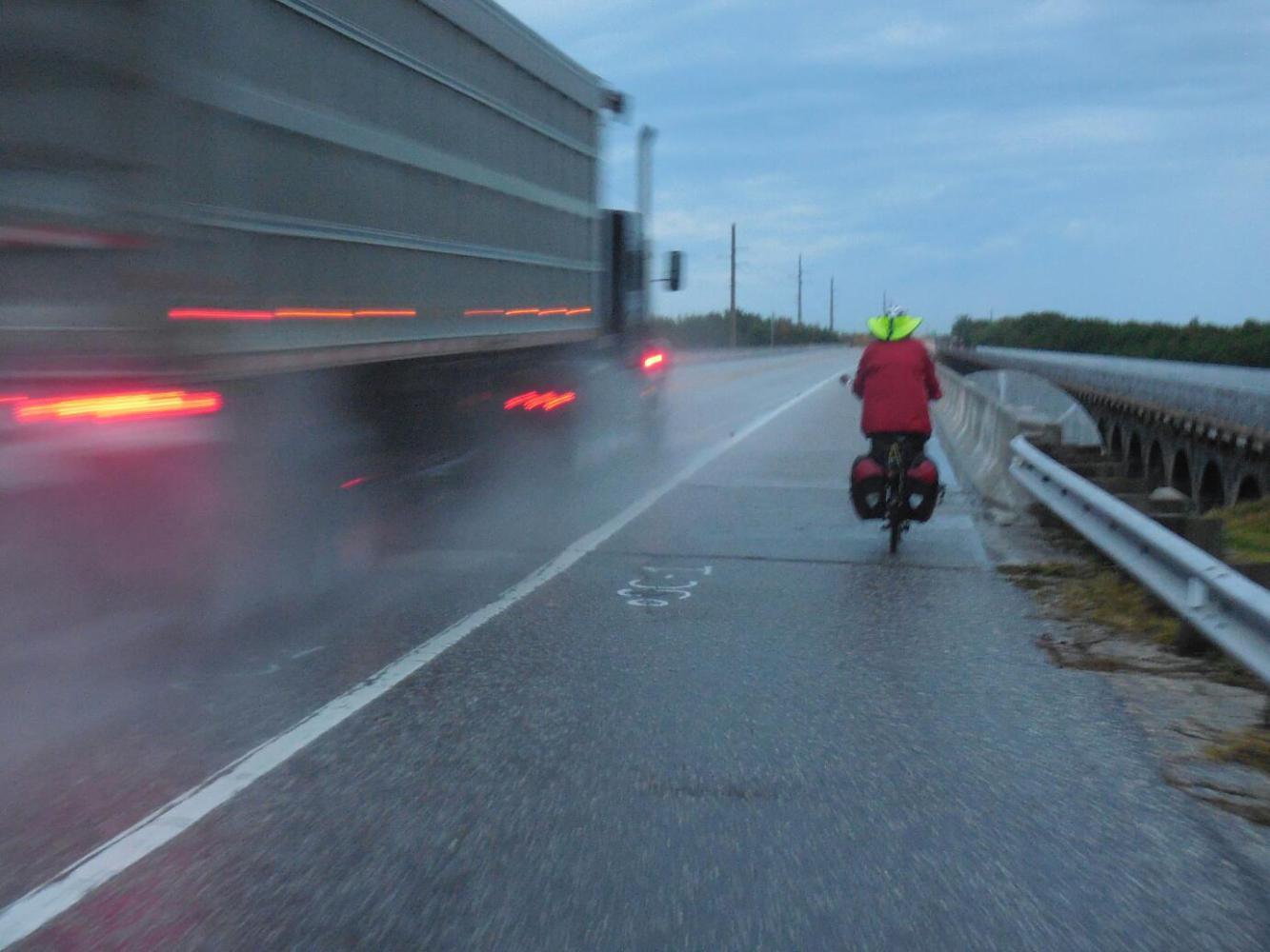 This simple idea and arithmetic calculation led to more excitement than we had been counting on in this simple circle of Vacationland. Four factors that were not in the original discussion entered, to make the situation livelier. First off, at 4:00 a.m. it was raining. (So much for my bragging yesterday that in this climate we could just sleep under a tree). And, as time passed, the rain got heavier. Next, it was dark (we could have predicted that!). And we were perched just at the start of the the Seven Mile Bridge. Like all bridges, it is narrow, and offers no where to hide if you need shelter, or are just generally terrified. Finally, night is when the big rigs seem to choose as the time to barrel down to Key West.