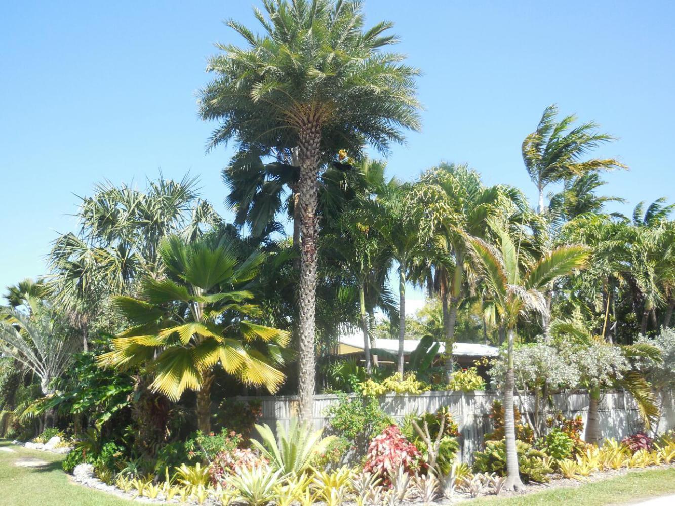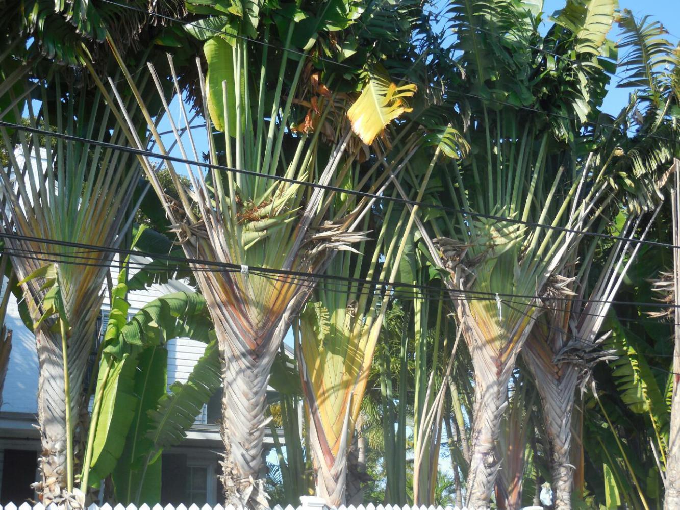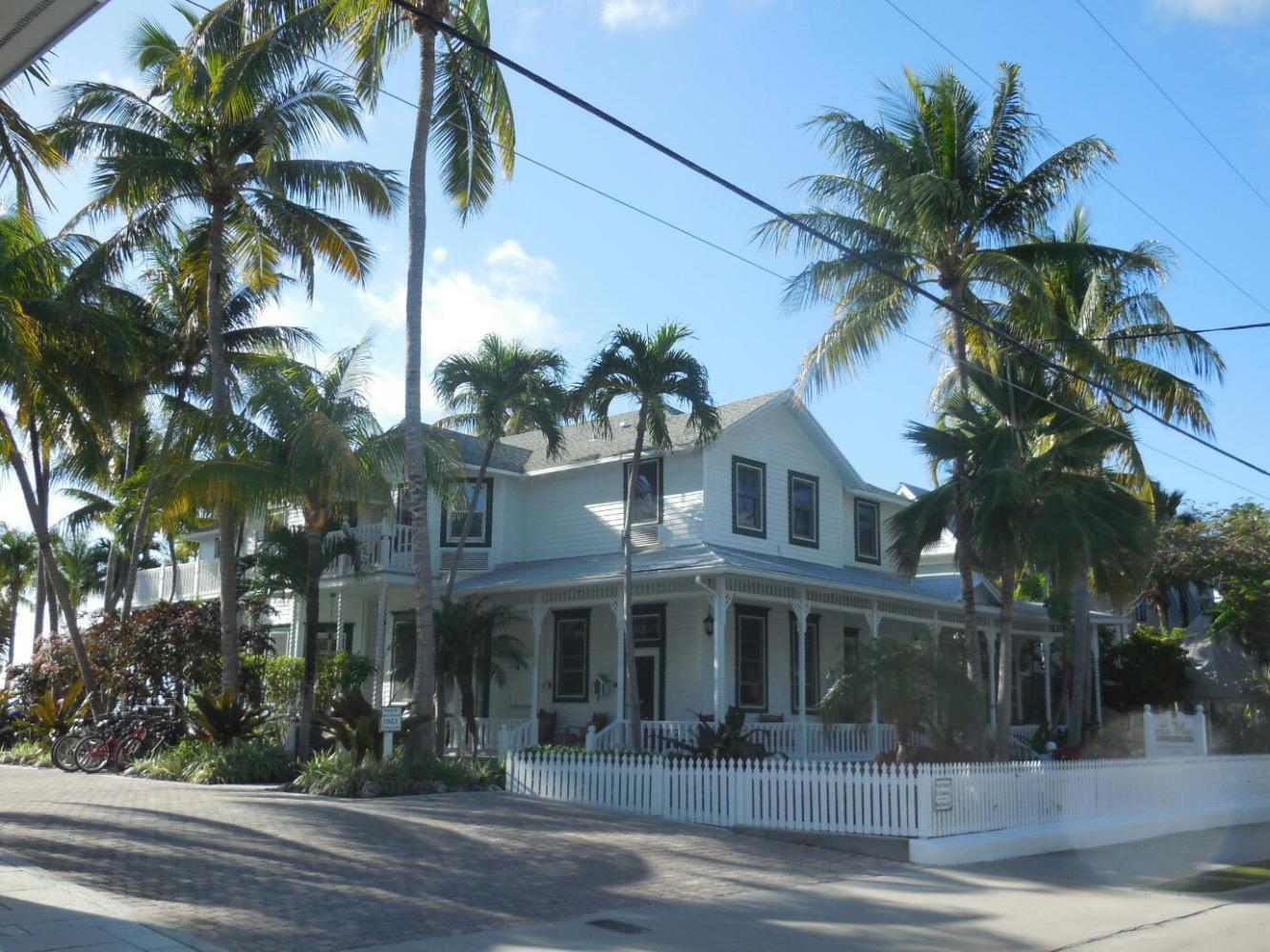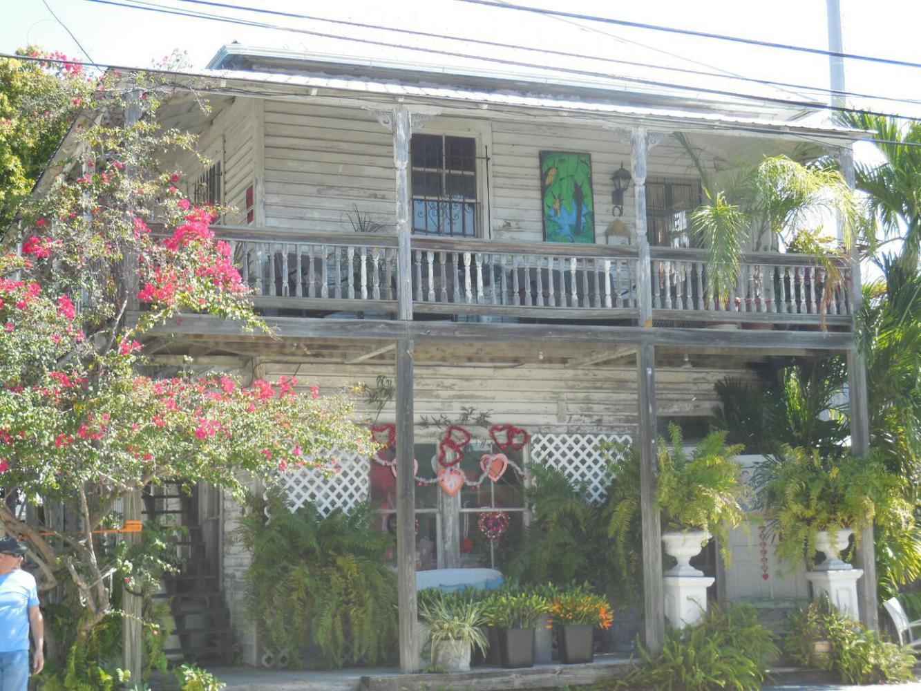From the end of the main beach area we entered the heart of downtown Key West. Much of Florida is not really "tropical", but way down here it looks suitably Carribean. That is, it is more lush than further north, and features more of Traveller's Palm, Bougainvillea, and such like. Then there is the architecture. It reminds us most of old town New Orleans, with many small wooden houses and many larger ones of two or three stories, with balconies, also all wood. Probably this style is most properly identified as Caribbean, and can be found in Jamaica, Bahamas, maybe Cuba, and so forth. In any event, when mixed with the foliage it looks great.