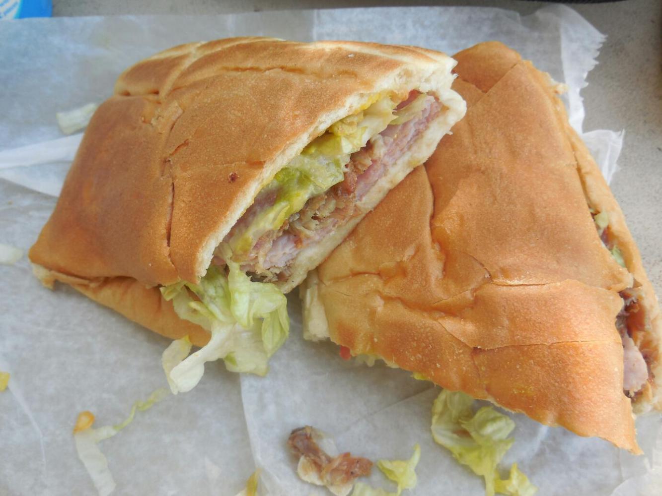 Needless to say, I was pretty darn pleased. That is, until it occurred to me that a perfect clone of a bakery style from a foreign country was not exactly an example of local cuisine. I put this problem to Michel, and we determined that something from Cuba, just 90 1/2 miles distant, could probably qualify as local. So off we went to Sandy's Cafe, advertising itself as the home of the original Cuban sandwich. According to Wikipedia, though the origin of the Cuban Sandwich may be murky, and though there may be claims from Tampa or Little Cuba in Miami, Key West is the first place mentioned. So hey Sandy's here we come. The Cuban man behind the counter, with the "Original Cuban Sandwich" tee shirt, said that the "mixed" would be the most original. This turned out to be a bun of Cuban bread with lots of roast pork bits, and cold cuts of beef and turkey. And.. it was great! Flavourful as can be, juicy, just totally yummy. For any French or German readers (and for the Alstons) I would say the closest thing is European Kabap. Anyway, another score for Key West!