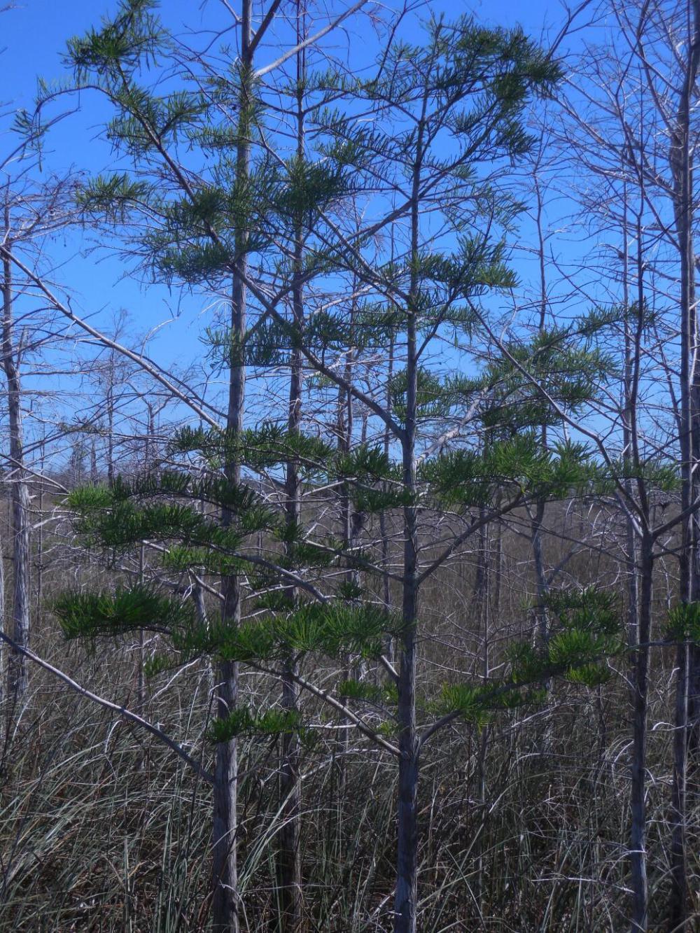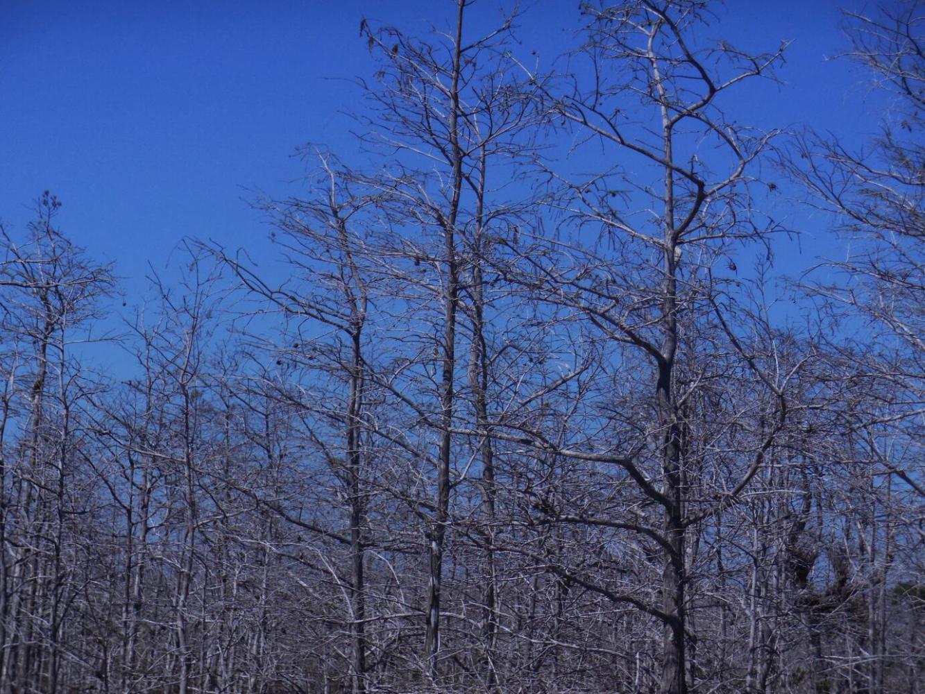 As we passed back along the territory we had covered two days earlier, we had another chance to appreciate the landscape. However, we still didn't take any of the 2 km side trips to points of interest. The most spectacular thing going on this route remains the dwarf, white, bald cypress forest. They are only bald and white in Winter, and we already found some that were leafing out. Still the white trees against the clear blue sky was quite a sight.